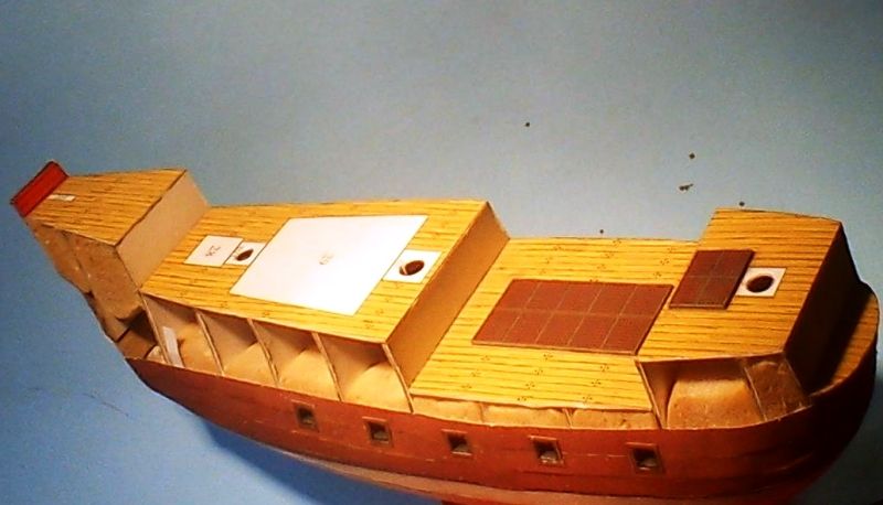 Witaj! Dawno nie robiłem w papierze, ale tak patrząc na to, co stworzyłeś to mam kilka uwag. Jeżeli jak twierdzisz dałeś piankę pod poszycie to chyba nie za bardzo to wyszlifowałeś, bo ci wylazły żeberka a jak masz zamiar to przemalowywać to może warto by było zerwać te poszycie i porządnie doszlifować. Druga sprawa to mimo że zdjęcie jest zrobione z daleka to widać, że nie za bardzo się przyłożyłeś do wycinania otworów w burtach, bo i z stąd widać ze nie najrówniej jest a szkoda, bo takie drobiazgi w dużej mierze rzutują na wygląd modelu. Warto by się może pokusić tez o retusz brzegów na trapach czy właśnie na tych otworach by ukryć ten biały papier wystarczy użyć choćby mazaka w odpowiednim kolorze i już będzie lepiej. Poczytaj trochę o sposobach i technikach przy budowie z papieru na pewno ci to dużo wyjaśni i pomoże.