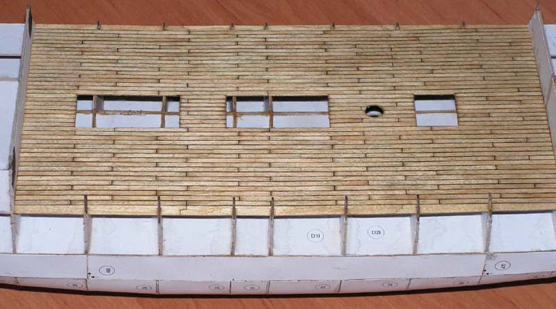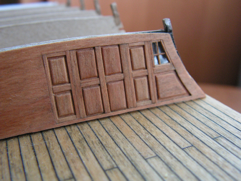 - Szczegóły nadburcia pokładu śródokręcia. Każdy odcinek pasowany oddzielnie. Podkład standardowo karton oklejony plankami z forniru brzozowego 0,6mm. Zaczepy armat drut miedziany 0,2mm opalony z lakieru i malowany.
