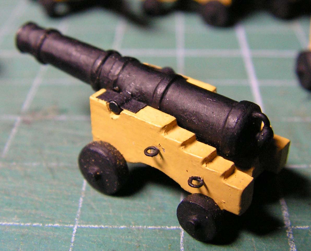 Oto "przepis" na armaty. Materiały: brystol, tektura 0,3mm, drut stalowy fi 1mm, szpilki, klej Butapren, Wikol i Super Glue, farba Humbrol czarny mat 3, szpachla modelarska.