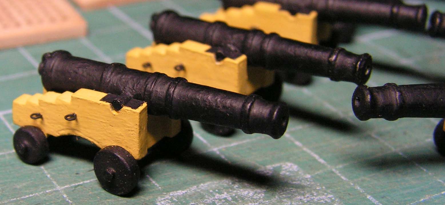 Oto "przepis" na armaty. Materiały: brystol, tektura 0,3mm, drut stalowy fi 1mm, szpilki, klej Butapren, Wikol i Super Glue, farba Humbrol czarny mat 3, szpachla modelarska.