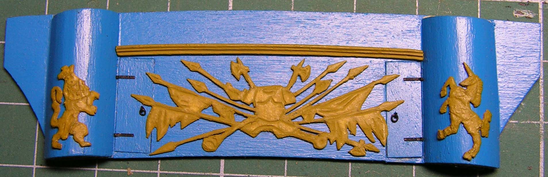 Malowideł bym nie zrobił, bo talentu Matejki brak. Pozostały więc dwie opcje. Albo zostawić gołe burty pomalowane na niebiesko, albo zrobić płaskorzeźby. Wybrałem płaskorzeźby, bo rufa jest przecież bardzo bogato zdobiona i te gołe burty nijak by nie pasowały. Naklejanie papierowych pasków z wycinanki skreśliłem od razu. Jak pisałem nie mam monografii ani planów HMS Bellona, więc uchybień/uproszczeń będzie pewnie więcej, bo schematy wycinanki są bardzo ubogie. No i najważniejsze buduję dla siebie
