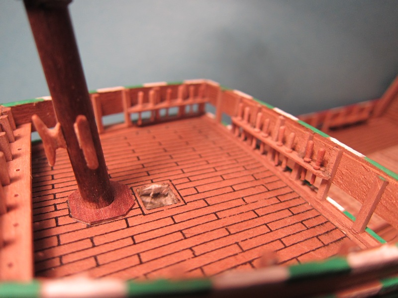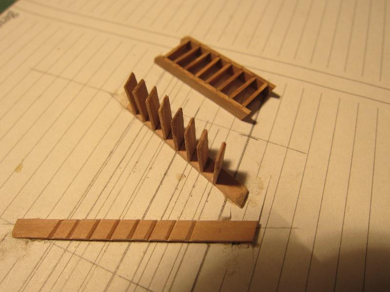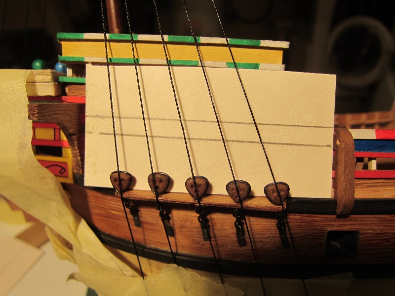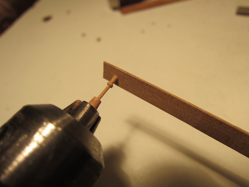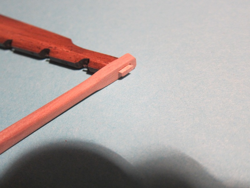W przypadku knag tego rodzaju, uznałem za wielokroć łatwiejsze wycięcie ich w ten sposób, niż dłubanie indywidualne każdej beleczki z osobna. Na pewno każda różniła by się od sąsiedniej. A tak są jednakowe. Nie będę ich zbytnio obciążał, nie zamirzam pływać w sztormie...