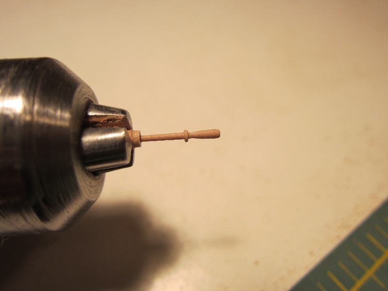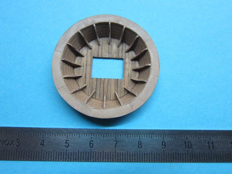 - Z uwagi na skalę modelu (1:75) oraz niewielkie wymiary elementu, nie zdecydowałem się na wykonanie stożków z listewek drewnianych. Jeszcze nie jestem aż taki „drobiazgowicz”. Zastąpiłem je papierem o takim samym kolorze, co moja grusza. Jeszcze raz pochwała dla tego drewna. Uważam, że jest świetne w modelarstwie!