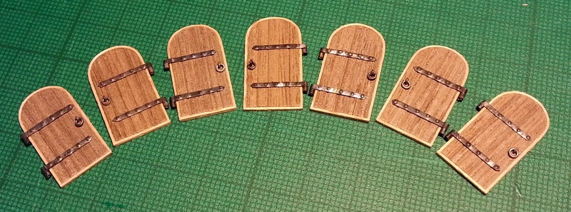 Zawiasy drzwi to blaszka po konserwie turystycznej grubości 0,2mm i pocięta w paseczki o szerokości około 1,2mm. Następnie powyciskałem nity za pomocą stępionego lekko gwoździka i małego młotka. Trzeba lać lekko żeby się nie przebić. Po kilku próbach wiedziałem już jakiej siły użyć aby każdy następny nit wyszedł w miarę podobnie. Tak potraktowane zawiasy lekko naprostowałem szczypkami przyklepując nieco nity. "Klamki" to drucik stalowy 0,5mm z torebki po chlebie, nawinięty na wiertło 1mm i następnie pocięty w pojedyńcze pierścienie. Wszystko opalone nad zapalniczką w celu poczernienia.