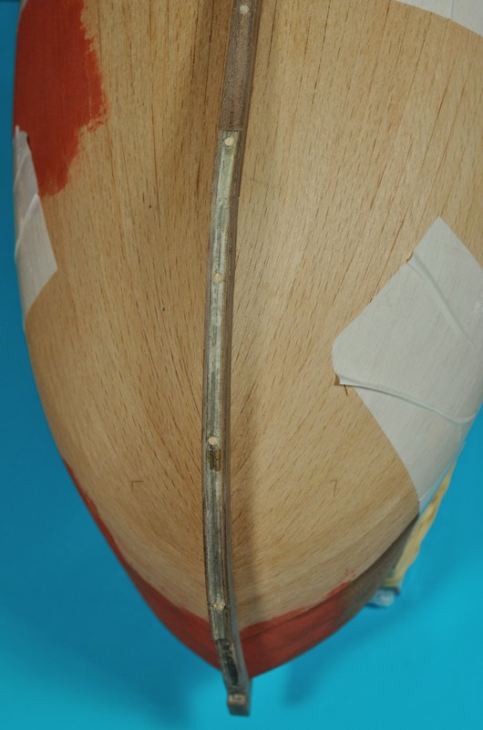 Pod kil wkleiłem listewkę o grubości odpowiadającej grubości poszycia by powstał tzw. rabbet. Po przyklejeniu kilu przypomniałem sobie, że przydało by się go wzmocnić jakimiś kołeczkami. Kil miałem już „zmontowany” i dlatego kołki teraz widać, ale na szczęście nie będę zbyt często oglądał modelu od dołu ;) Stewa rufowa jest „tylko” przyklejona.