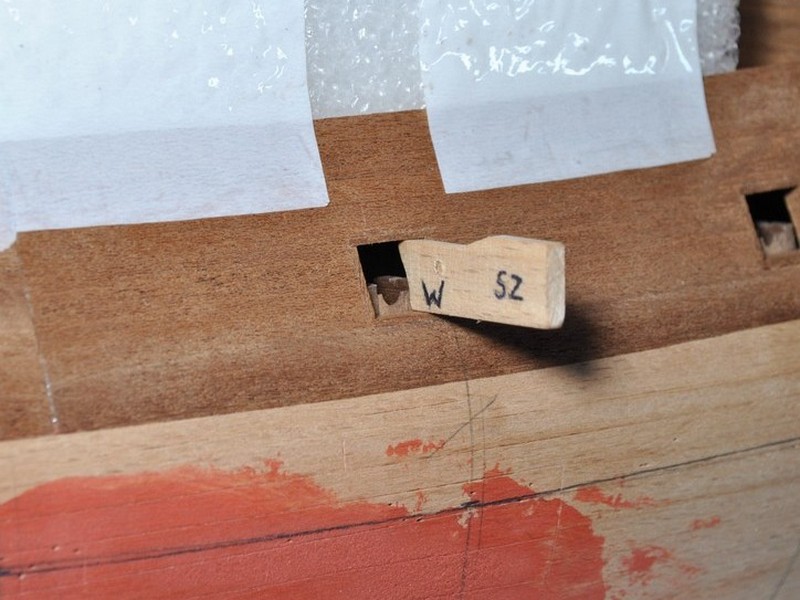 Jako kolejny krok wypadało by wyznaczyć linię odbojnic i zabierać się za poszywanie kadłuba. Łatwo powiedzieć ;) Spróbowałem zrobić to przyklejając taśmą na model elementy poszycia wycinanki i odrysować przebieg odbojnic. Te rysunki na kadłubie to właśnie z pierwszych prób. Wydawało mi się jednak, że to mało dokładny sposób gdyż brakowało mi jakiegoś punktu odniesienia na modelu. Wstrzymałem się zatem i postanowiłem najpierw wyciąć ambrazury w burtach i wkleić felce. Ze względu na nieregularny kształt ambrazur felce powstawały w sposób listewka po listewce, każda dopasowywana indywidualnie. Trochę się namęczyłem ale z efektu końcowego jestem zadowolony.