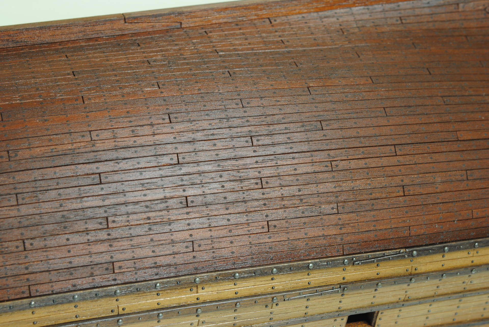 Chyba postawiłem sobie poprzeczkę nieco za wysoko i model mnie zwyczajnie przerósł. Udało mi się jedynie skończyć poszycie denne i nadać mu nieco koloru. Od tamtego momentu moją uwagę zajęły inne, mniejsze projekty, a obecnie kartonówki. Forum jednak ciągle podglądam i z ukrycia zachwycam się niesamowitymi modelami które tu powstają