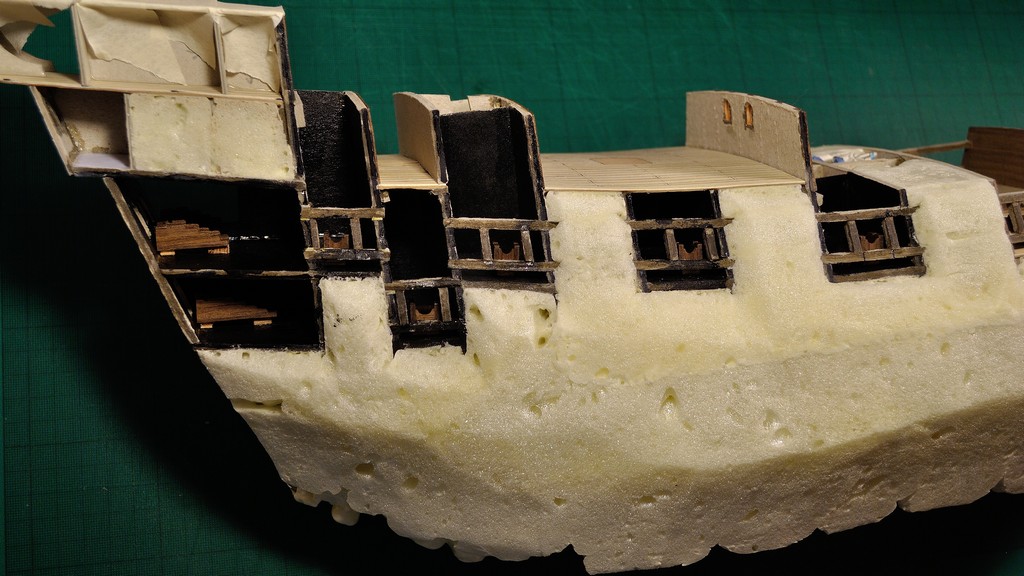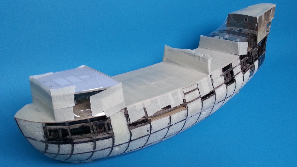 Obciąłem nadmiar pianki, lekko przeszlifowałem, i przygotowałem kadłub do szpachlowania i szlifowania. Zanim jednak to zrobiłem, wkleiłem pokład główny i dorobiłem przednią ściankę kasztelu dziobowego.