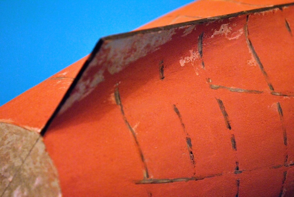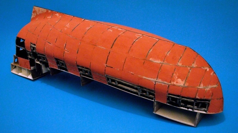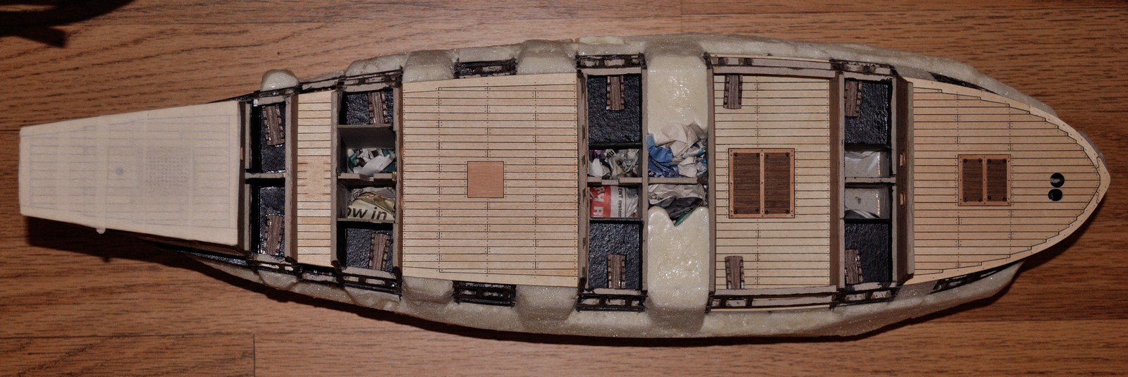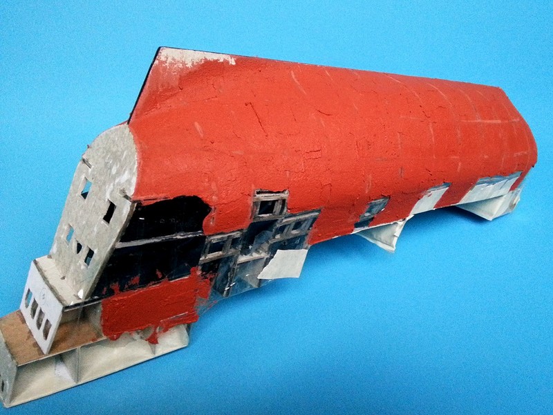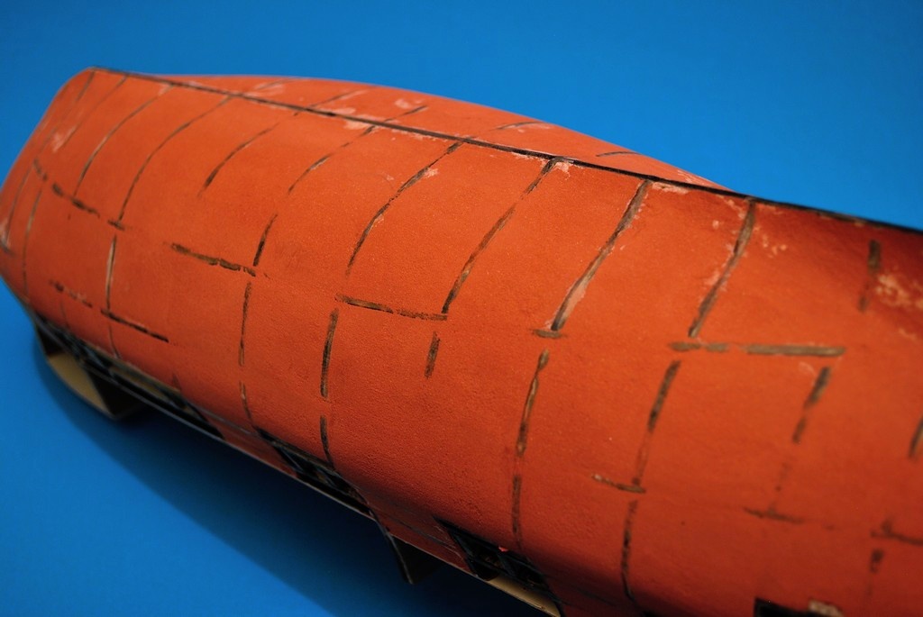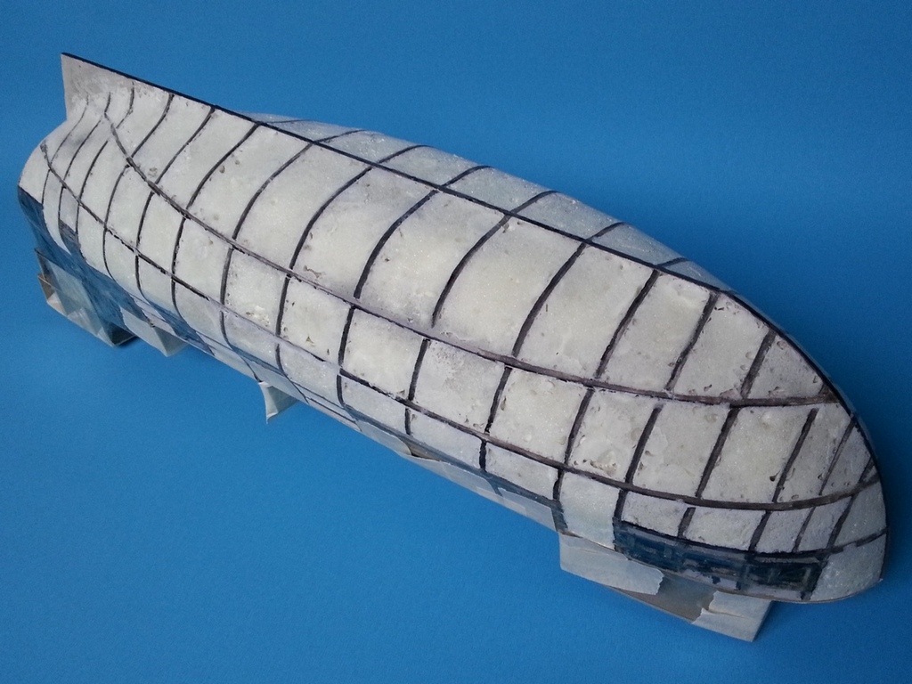 Szkielet z tektury 3mm plus dość gęsto rozmieszczone wręgi i pianka nie narobiła żadnych szkód, tzn. nie powykrzywiała szkieletu. Lekko wypaczyły się pokłady podklejone cienkim brystolem, ale za to mam nauczkę na przyszłość aby wklejać je później lub użyć szablonu zamiast nich.