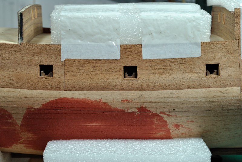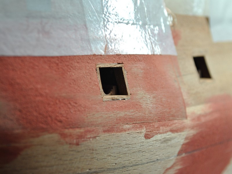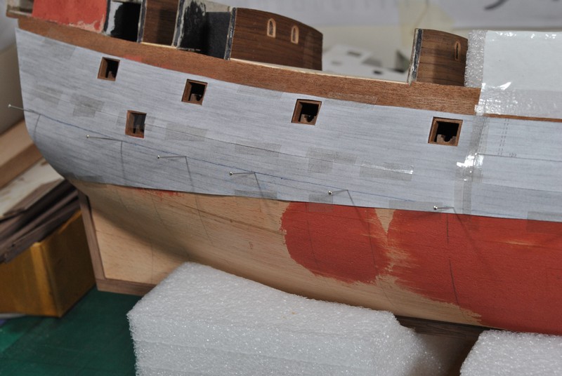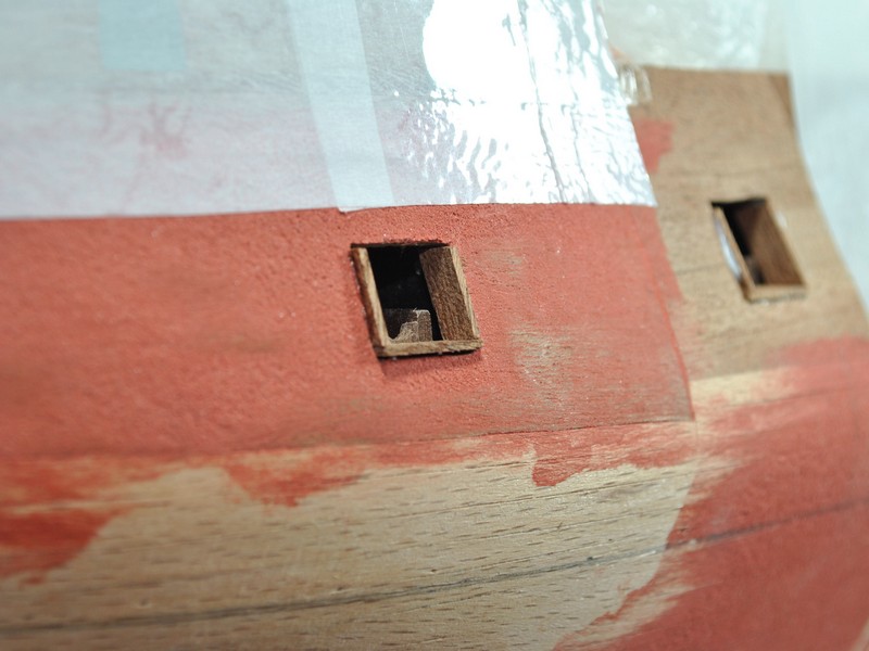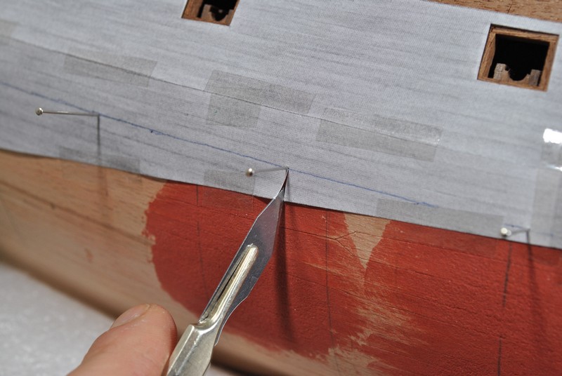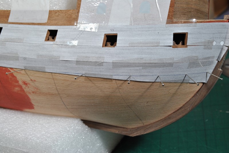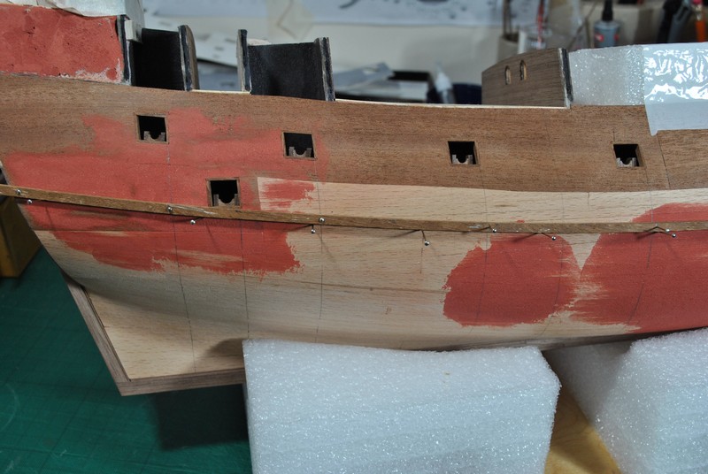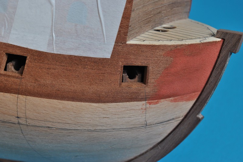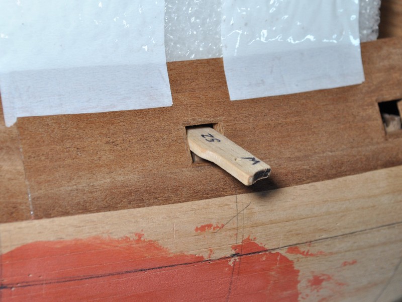 Jako kolejny krok wypadało by wyznaczyć linię odbojnic i zabierać się za poszywanie kadłuba. Łatwo powiedzieć ;) Spróbowałem zrobić to przyklejając taśmą na model elementy poszycia wycinanki i odrysować przebieg odbojnic. Te rysunki na kadłubie to właśnie z pierwszych prób. Wydawało mi się jednak, że to mało dokładny sposób gdyż brakowało mi jakiegoś punktu odniesienia na modelu. Wstrzymałem się zatem i postanowiłem najpierw wyciąć ambrazury w burtach i wkleić felce. Ze względu na nieregularny kształt ambrazur felce powstawały w sposób listewka po listewce, każda dopasowywana indywidualnie. Trochę się namęczyłem ale z efektu końcowego jestem zadowolony.