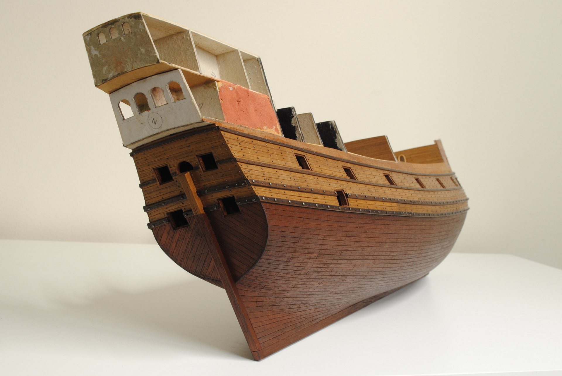 Revenge leżakuje sobie w pudle i czeka aż się do niego przemogę ;-) Chyba postawiłem sobie poprzeczkę nieco za wysoko i model mnie zwyczajnie przerósł. Udało mi się jedynie skończyć poszycie denne i nadać mu nieco koloru. Od tamtego momentu moją uwagę zajęły inne, mniejsze projekty, a obecnie kartonówki. Forum jednak ciągle podglądam i z ukrycia zachwycam się niesamowitymi modelami które tu powstają :-) A sam model prezentuje się na chwilę obecną tak: