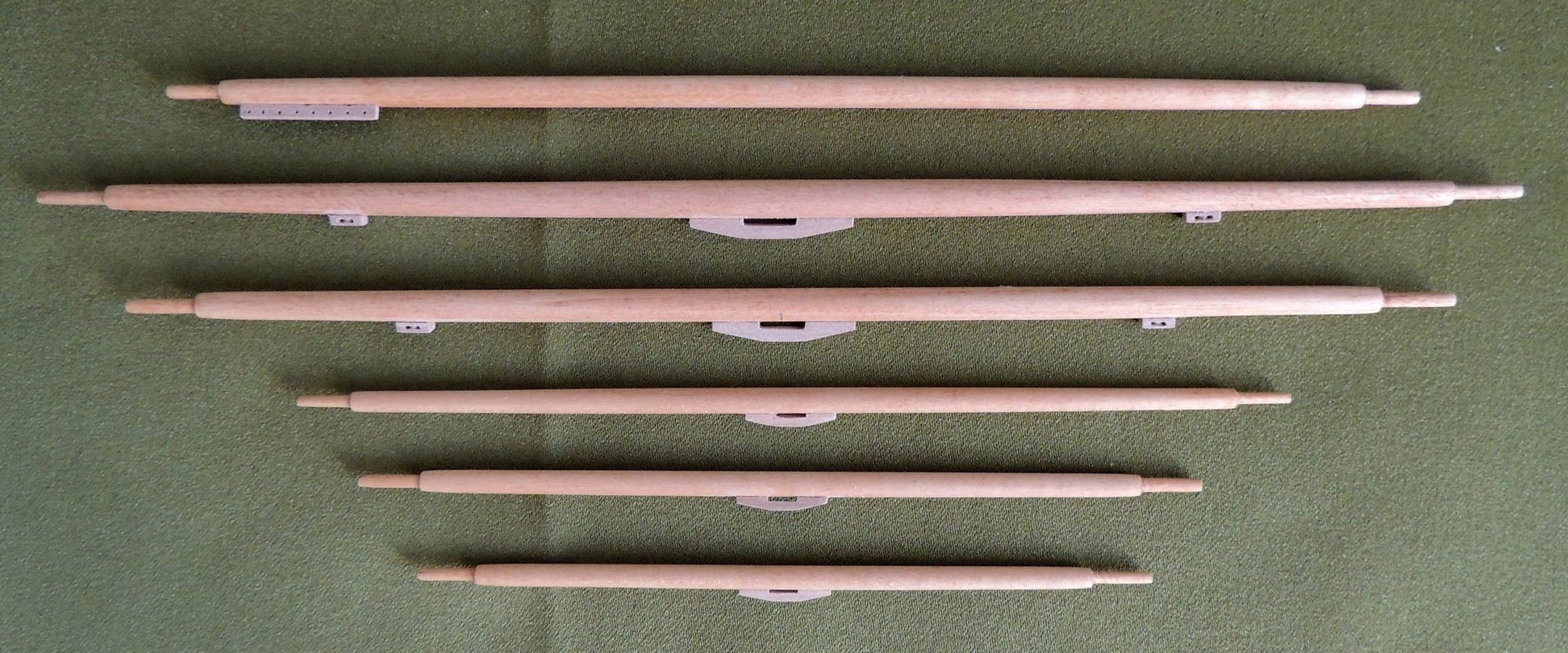 Cześć. Żagle gotowe. Te trzy z prawej zredukowałem, aby łatwiej było je podwinąć. Jak to wyjdzie w praktyce to zobaczymy.A skoro mam już żagle, to wypada zająć się rejami.