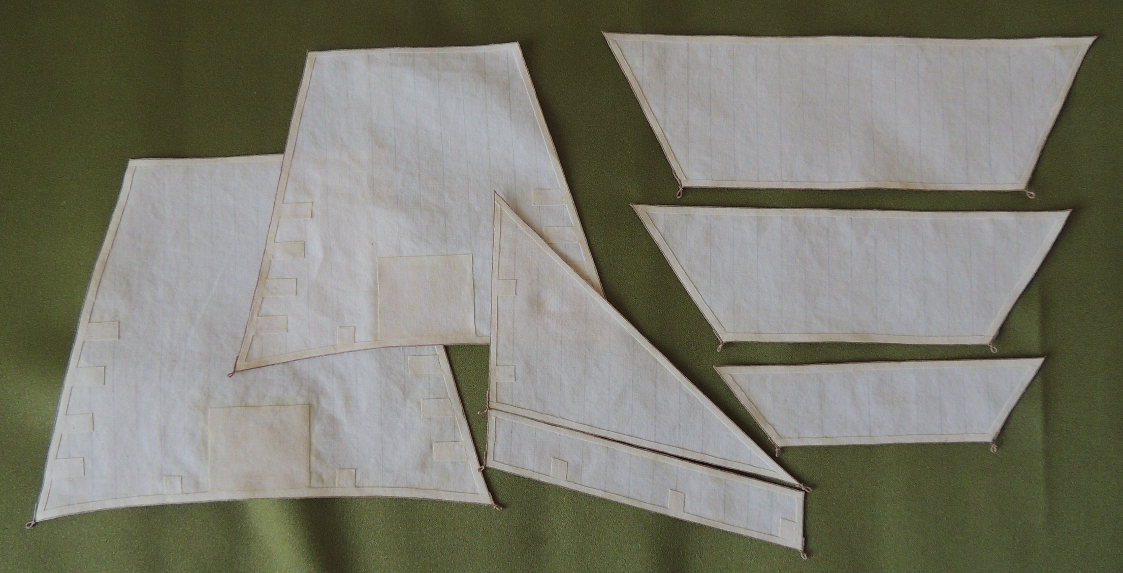 Cześć. Żagle gotowe. Te trzy z prawej zredukowałem, aby łatwiej było je podwinąć. Jak to wyjdzie w praktyce to zobaczymy.A skoro mam już żagle, to wypada zająć się rejami.