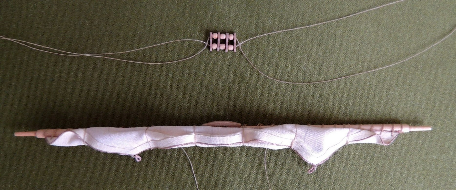 Stworzyłem pierwszy żagielek. Materiał to jakieś cienkie płótno. Barwienie herbatą. Wzmocnienia i liklinka klejone na Bison super wood. Imitacja brytów żagla zrobiona zwykłym ołówkiem