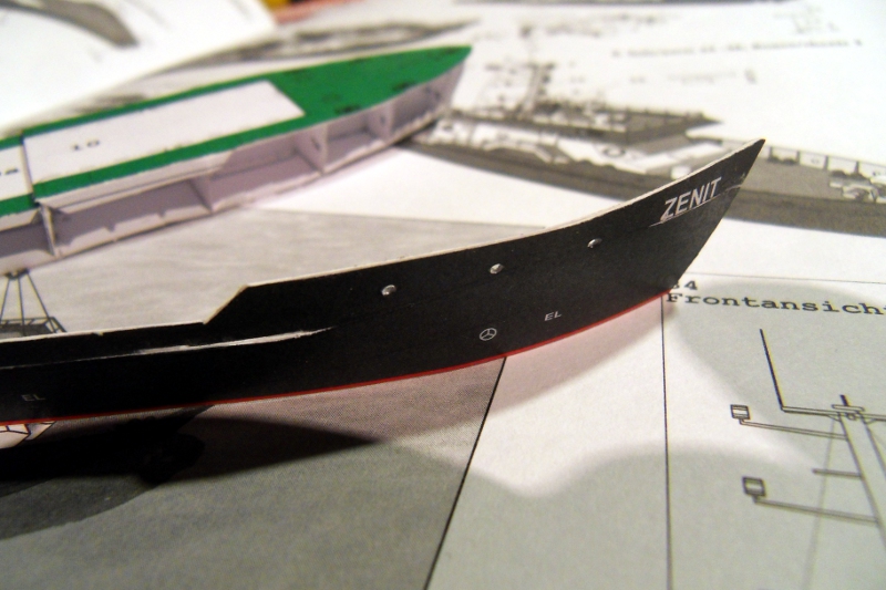 po sklejeniu w całość, krawędzie retuszowałem akrylową farbką ... Hellera ( akurat taka była pod ręką ) otwory kluz były wycinane przy pomocy igły lekarskiej, obciętej i delikatnie spłaszczonej w celu nadania owalnego kształtu, i młotka, którym wybijałem te otworki ... problem z tym narzędziem jest taki, że to jednorazówka a do tego trudno ustawić w odpowiedniej pozycji, myślę że kolejnym razem wsadzę taką igłę w uchwyt cyrkla, powinno się łatwiej manewrować .