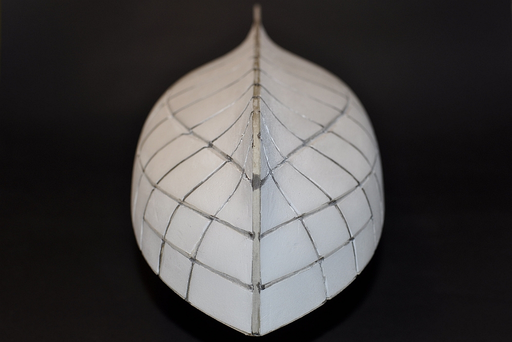 Części szkieletu zostały naklejone na tekturę o podwojonej grubości. Zastosowałem tekturę o grubości 3 mm (trudno się ją tnie nożykiem), 2 mm i 1 mm. Części przyklejałem na obrzeżu Pattex'em Express, aby po wycięciu łatwo dało się je oderwać od tektury. Wycięcie szkieletu zajęło mi ponad jeden tydzień. Całość została złożona najpierw „na sucho” następnie poszczególne elementy szkieletu przyłapałem punktowo klejem Kropelka. Po sprawdzeniu osiowości i kątów prostych wszystkie połączenia zostały zalane tym samym klejem (zużyłem sześć tubek). Końcówki wręg zabezpieczyłem przed rozwarstwianiem również Kropelką.