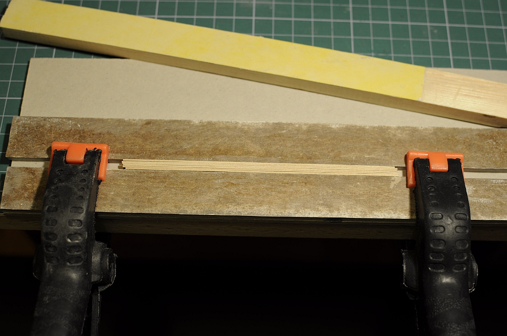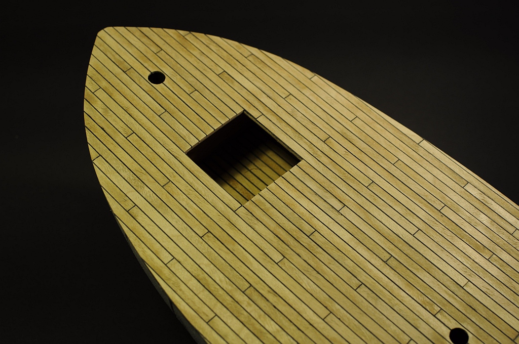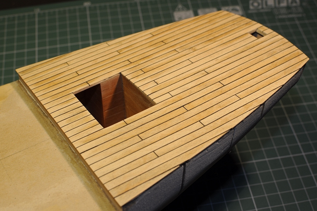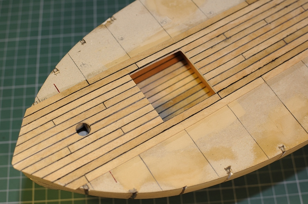 Rozpocząłem deskowanie pokładu fornirem (fornir brzozowy). Deseczki szer. 4 mm z wklejonym czarnym kartonem 0,2 mm. Układ deskowania zgodny z planami Shipyard.