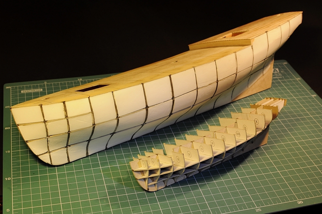 Kołkowanie pokładu wykałaczkami zostało ukończone (kilkaset sztuk!). Kadłub został pozbawiony tzw. „krowich żeber” papierem ściernym (gradacja 80). Celowo zastosowałem grubszy papier ścierny by uzyskać „głębokie” rysy na styrodurze. Ma to na celu lepsze trzymanie się kleju. Dodatkowo wypełniłem szpachlą puste miejsca szkieletu.