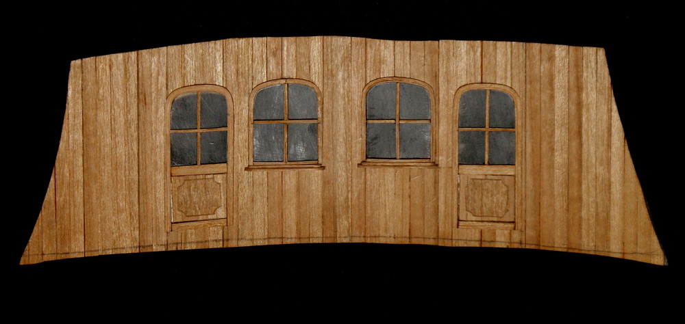 Gabaryty ścianki są z naddatkami na dopasowanie do kadłuba. Okna i drzwi wklejone kropelką patexu. Całość wymaga jeszcze dopieszczenia