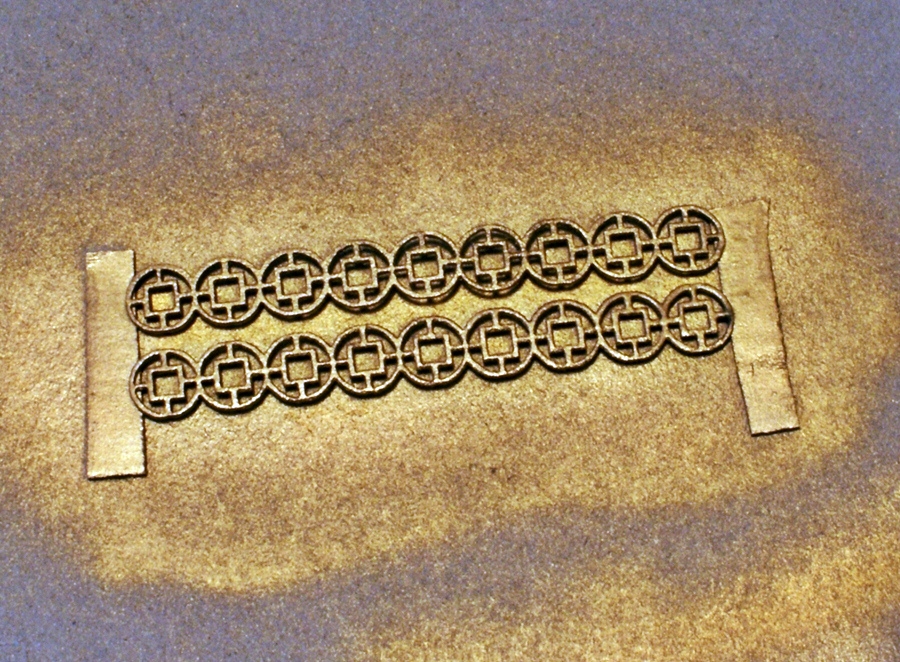 jedna strona ażuru zaimpregnowana caponem, druga zabarwiona czarnym tuszem. Strona zaimpregnowana caponem będzie malowana humbrolem.