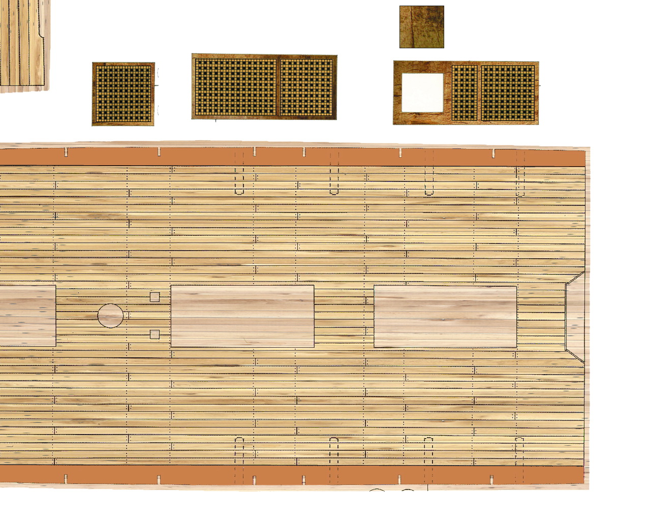 Jeśli chodzi o sposób wykonania deskowania to niestety wygląda to tak sobie. Nacinanie spowodowało, że krawędzie nacięć „wypiętrzyły się” i tym samym pokład nie jest już płaski, a taki powinien być. Nie do przyjęcia jest również efekt „rozchwianych desek”. Lepiej byłoby pozostawić ten pokład wydrukowany, bez kombinowania z trasowaniem. Jeśli już chodzi o poprawność historyczną, pokład w tym miejscu nie miał szpar. Poszukaj sobie zdjęć choćby Victory.