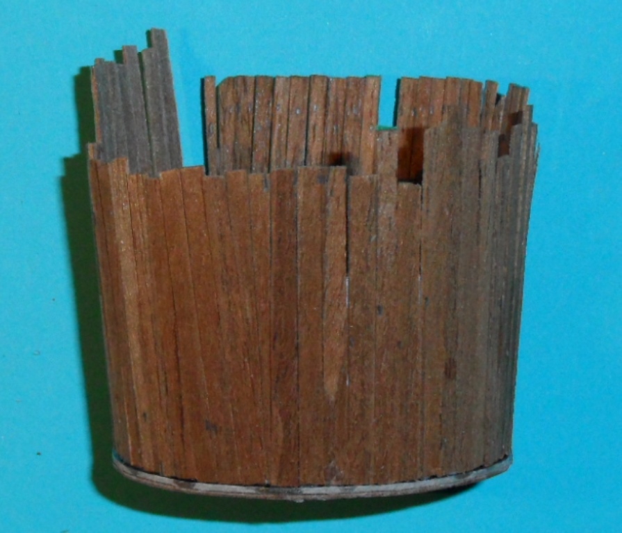 A tu bocianie gniazdo posadowione na maszcie. Czarne obejmy to wąski pasek czarnego kartonu przyklejony wg planów. Całość pomalowana caponem.