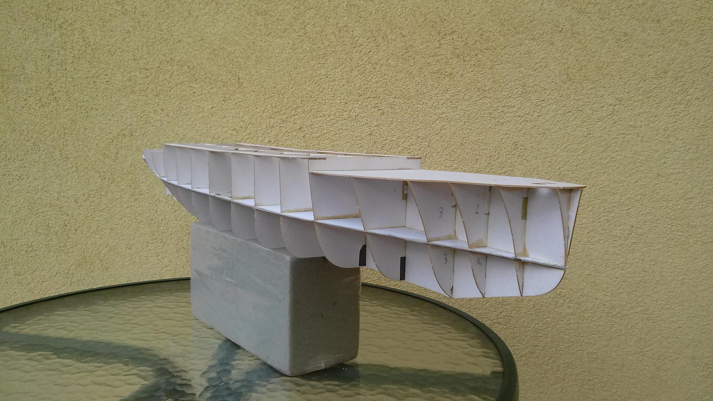 Małe postępy w budowie. Robię podposzycie z tektury. Metoda pracochłonna, robię pierwszy raz, ale na pewno nie ostatni. Bardzo mocno usztywnia kadłub no i można swobodnie łapać model bez obawy o wgniecenie poszycia.