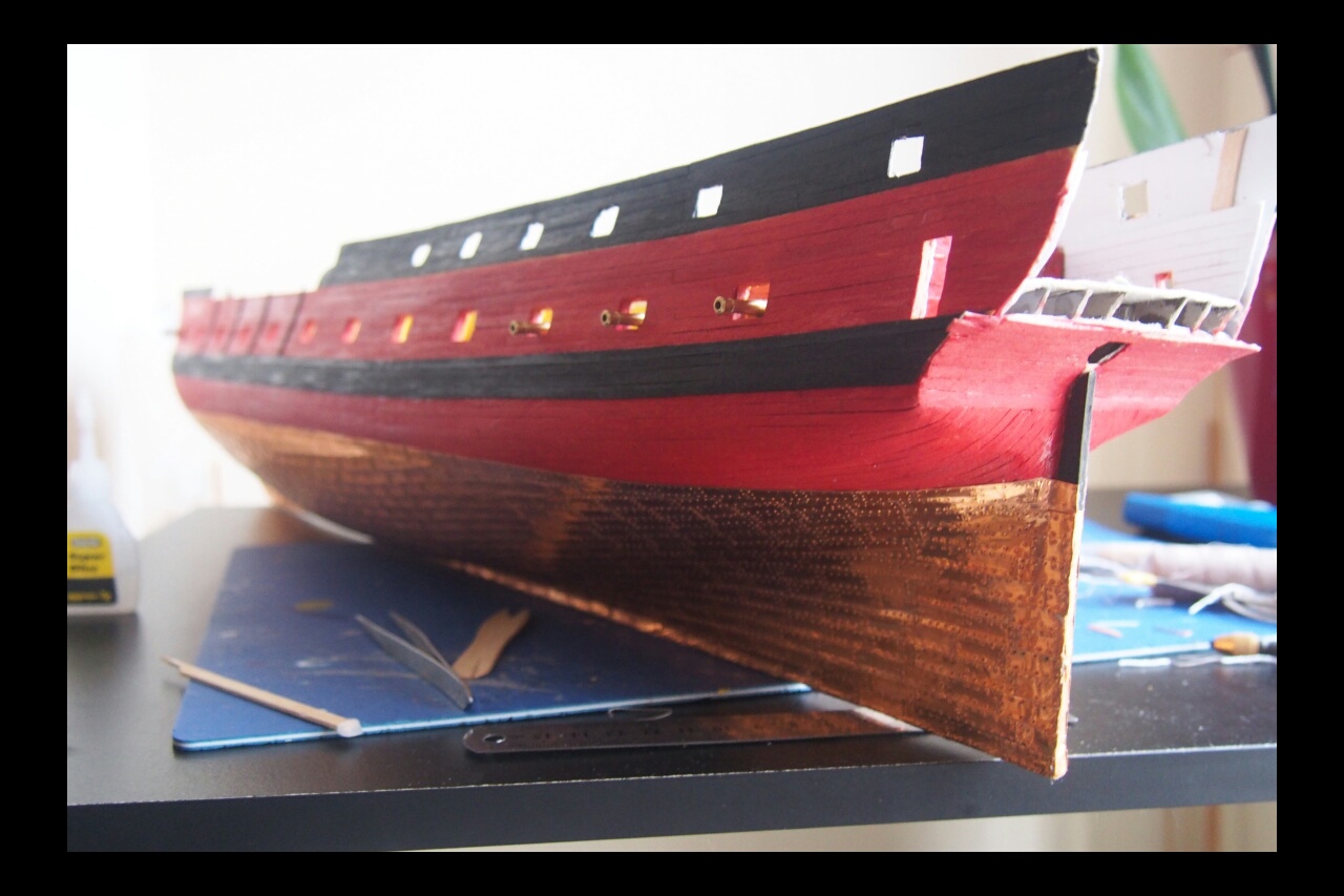 Mała aktualizacja. Fotki na dzień dzisiejszy. W miarę możliwości postaram się zamieszczać zdjęcia z toku budowy. Wszystko oczywiście jeszcze na sucho. Połowa miedziowania zakończona. Jak ukończę drugą połowę to zacznę mocować elementy wyposażenia pokładu i oczywiście uzbrajać armaty.