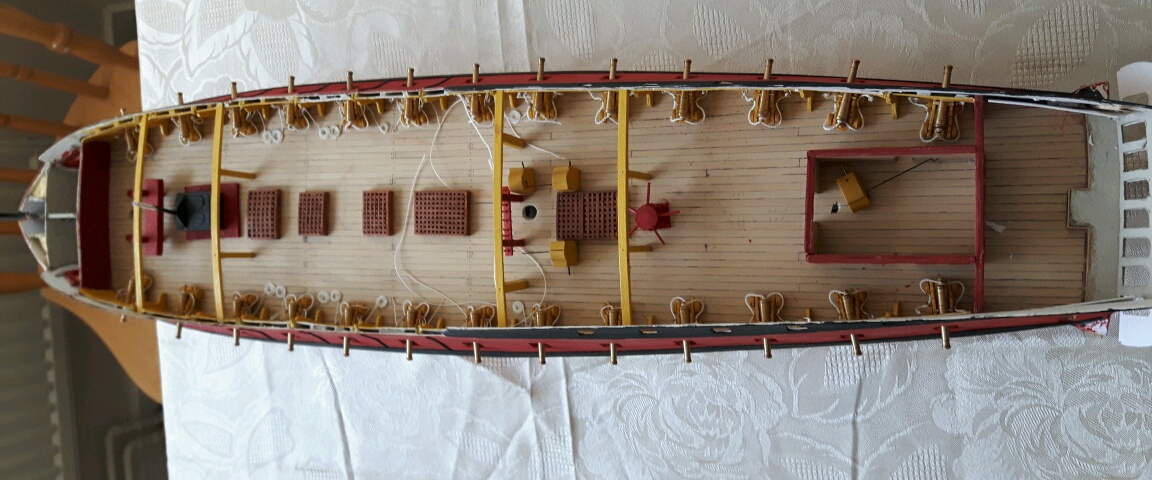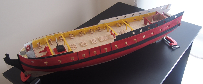 Mała aktualizacja. Fotki na dzień dzisiejszy. W miarę możliwości postaram się zamieszczać zdjęcia z toku budowy. Wszystko oczywiście jeszcze na sucho. Połowa miedziowania zakończona. Jak ukończę drugą połowę to zacznę mocować elementy wyposażenia pokładu i oczywiście uzbrajać armaty.