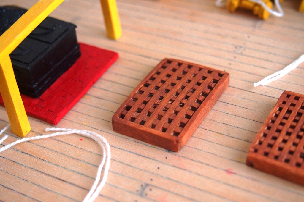 Niedziela i chwila wolnego czasu. Ciąg dalszy walki z olinowaniem dział. Zamówione bloczki okazały się zbyt duże w stosunku do lawet, więc niestety trzeba wykonać je samodzielnie.