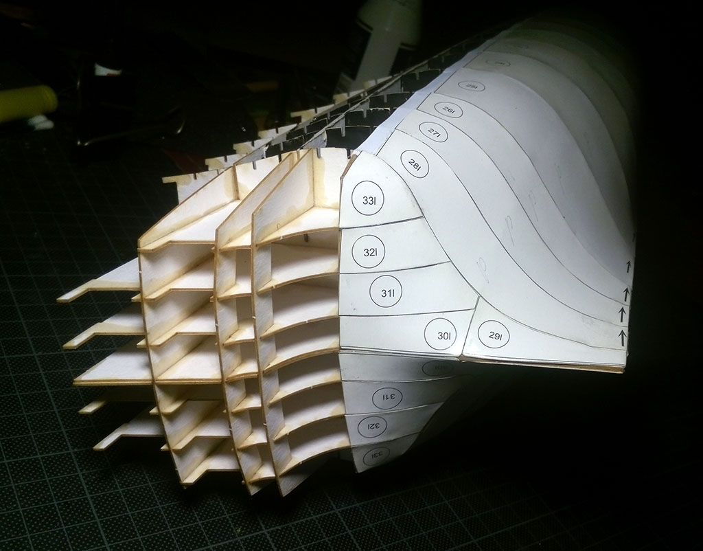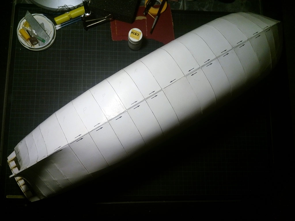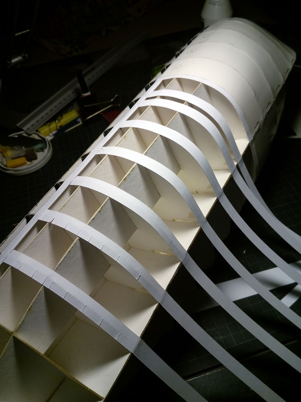Podposzycie dolnej części kadłuba. Nie musi być wykonane tak starannie jak dla modelu całkowicie kartonowego, gdyż listewki będą klejone punktowo na wręgach.
