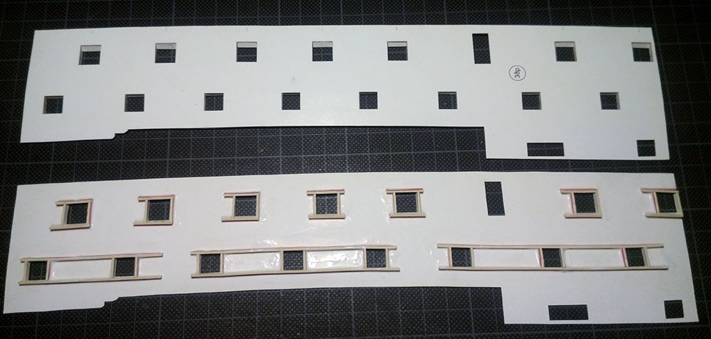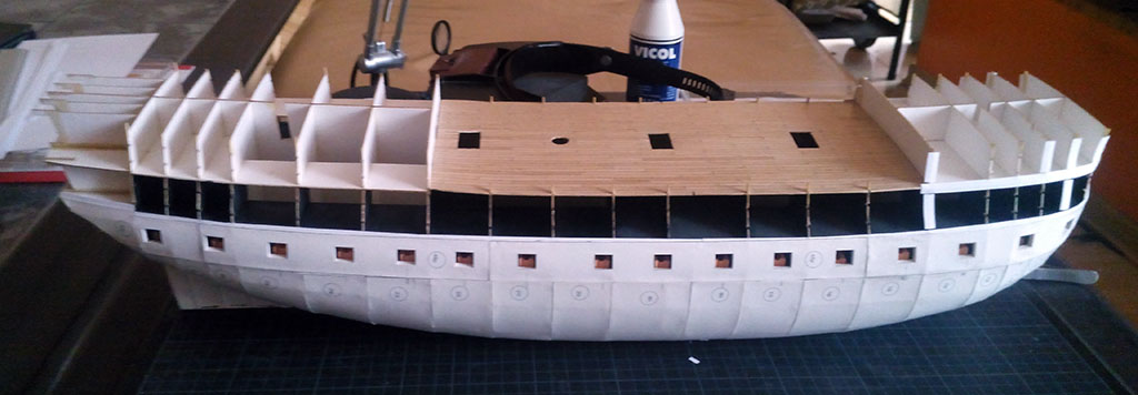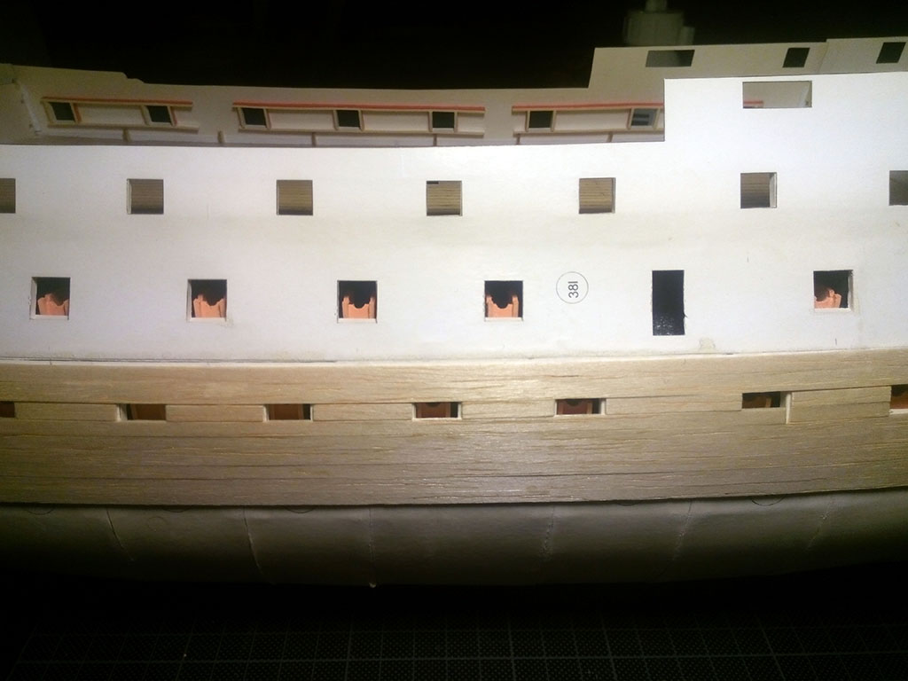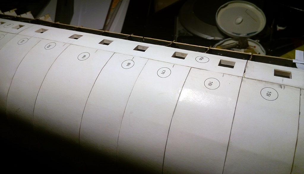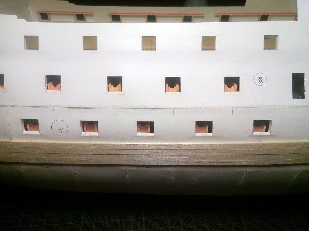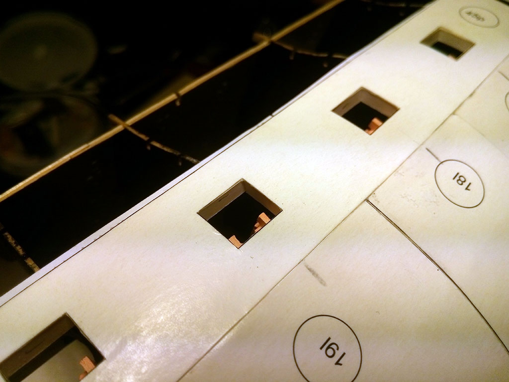 Dalsze oklejanie podposzycia, obramowanie furt armatnich kleje jak wszyscy poprzednicy bezpośrednio do burt. Ponieważ będę je malował, a nowy kolor jest inny niż wycinankowy kleję stroną bez nadruku do wewnątrz, gdzie mam tekturę kredowaną.