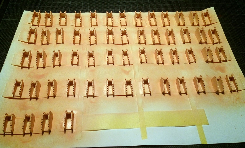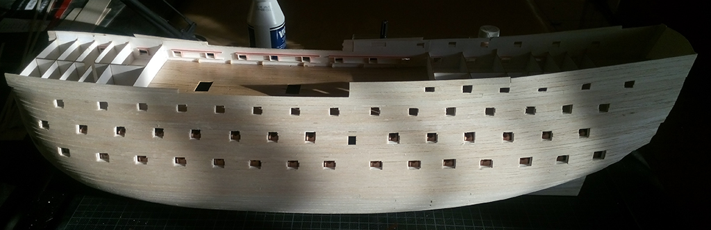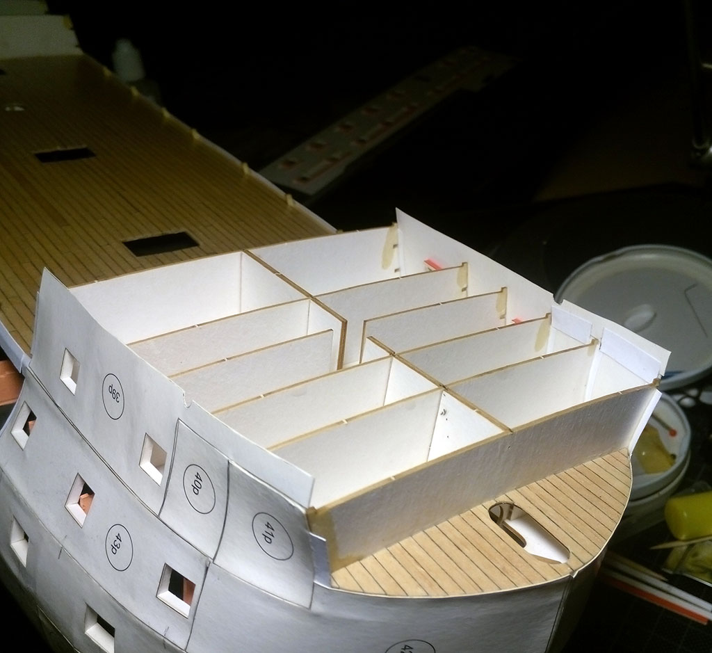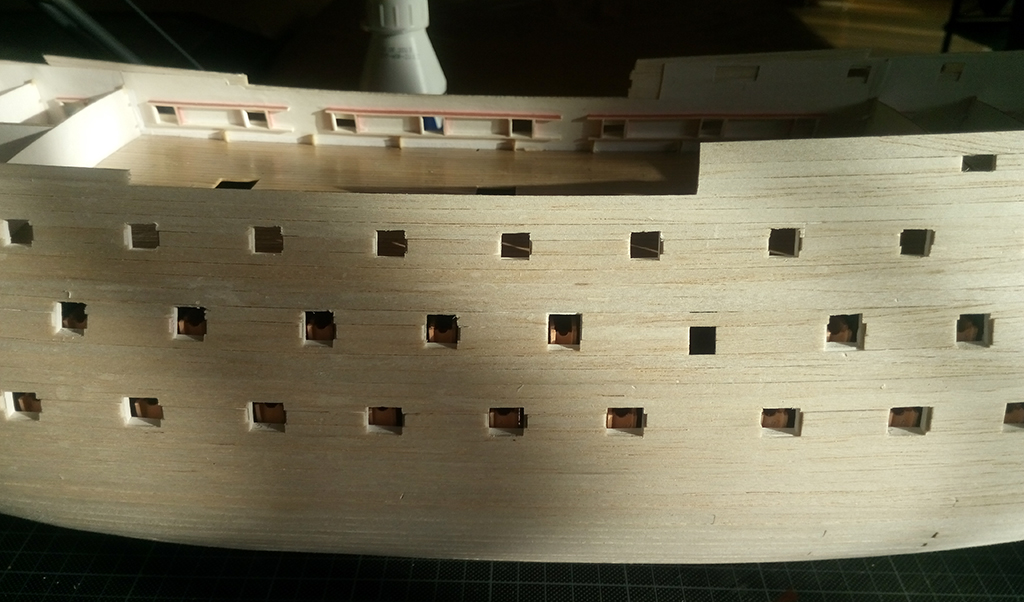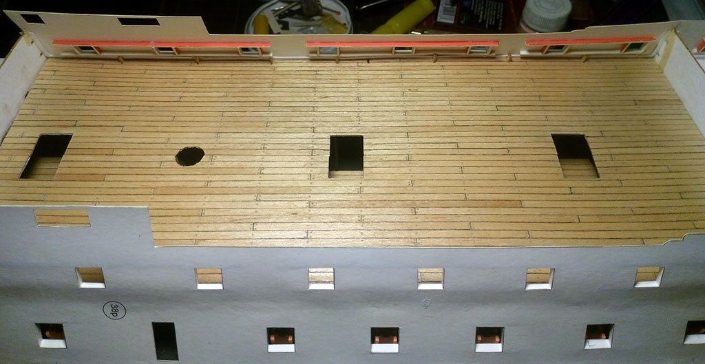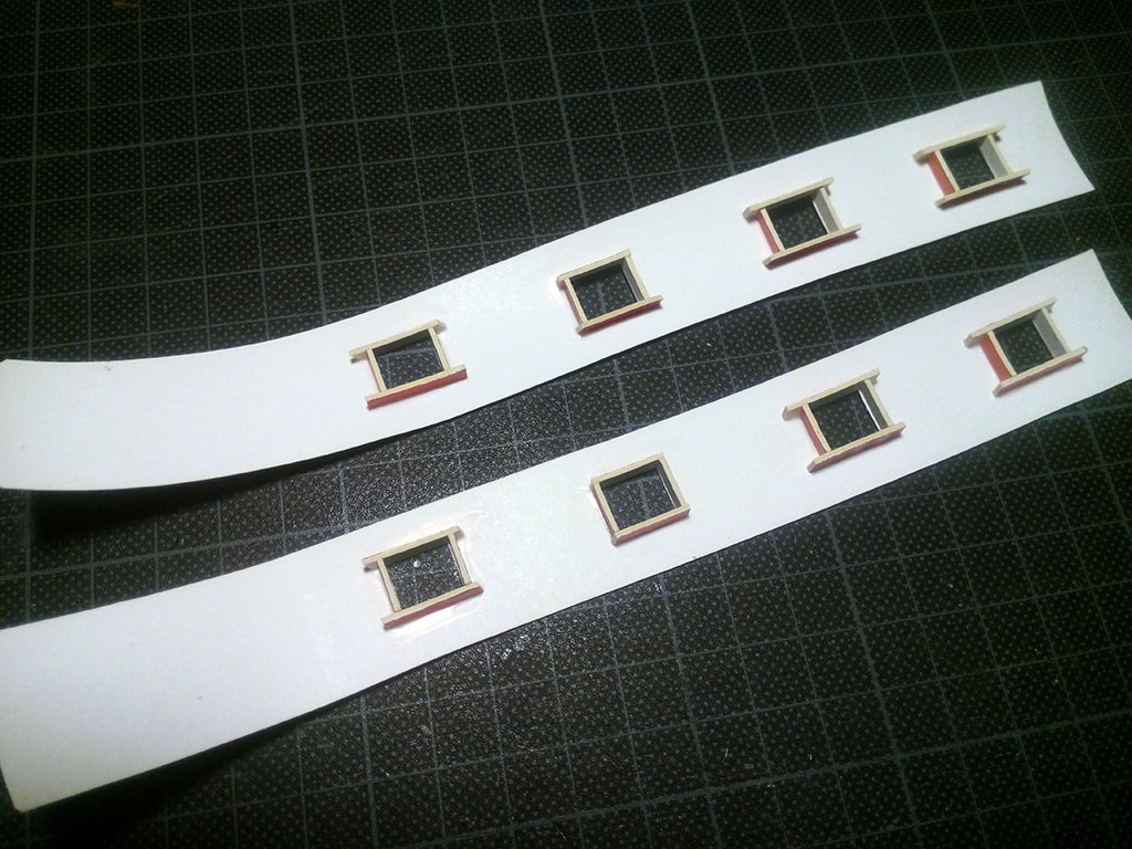 Dalsze oklejanie podposzycia, obramowanie furt armatnich kleje jak wszyscy poprzednicy bezpośrednio do burt. Ponieważ będę je malował, a nowy kolor jest inny niż wycinankowy kleję stroną bez nadruku do wewnątrz, gdzie mam tekturę kredowaną.