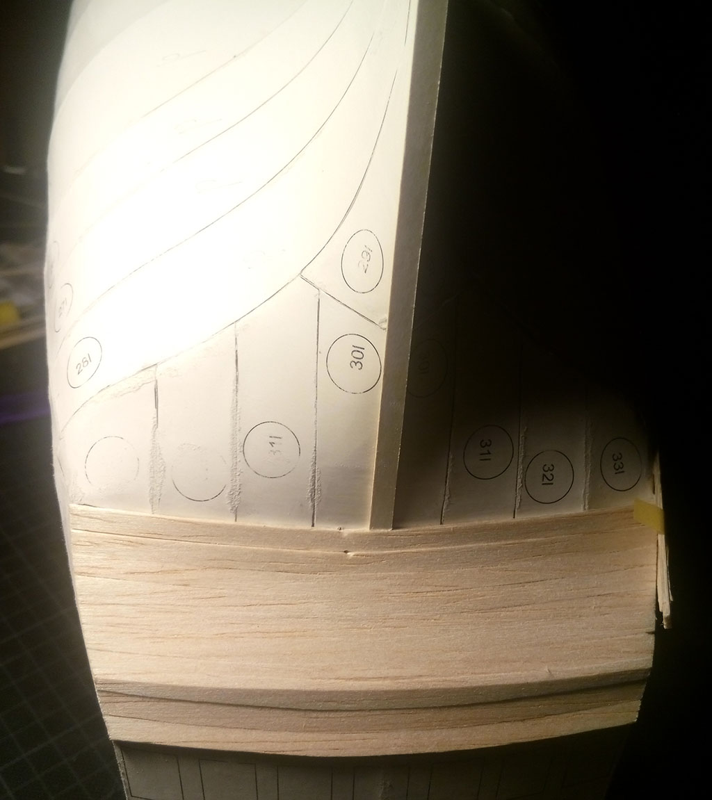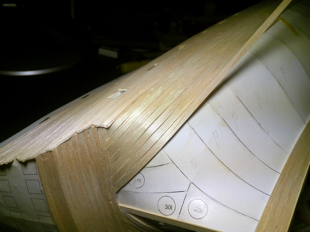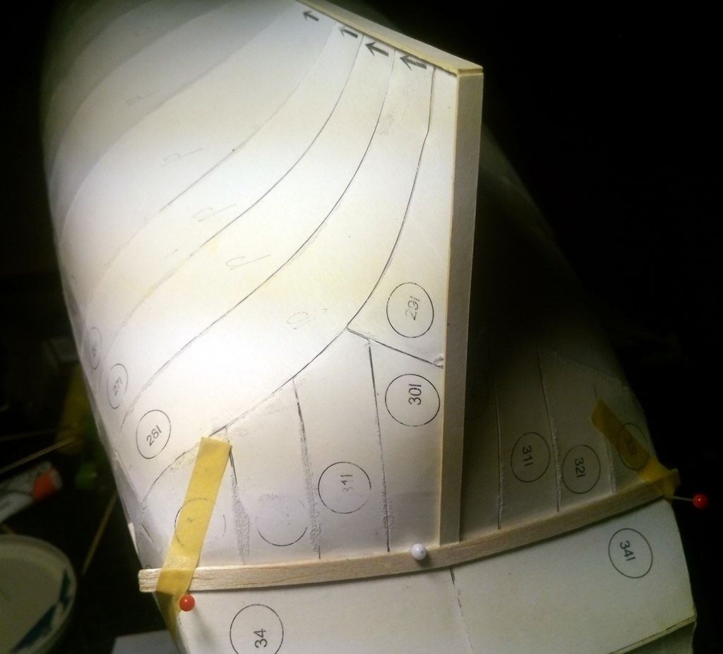 Przykleiłem podstawę pod stępkę i zacząłem oklejanie listewkami z balsy grubości 1mm, na początek kawałek rufy