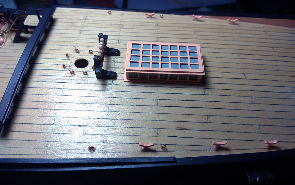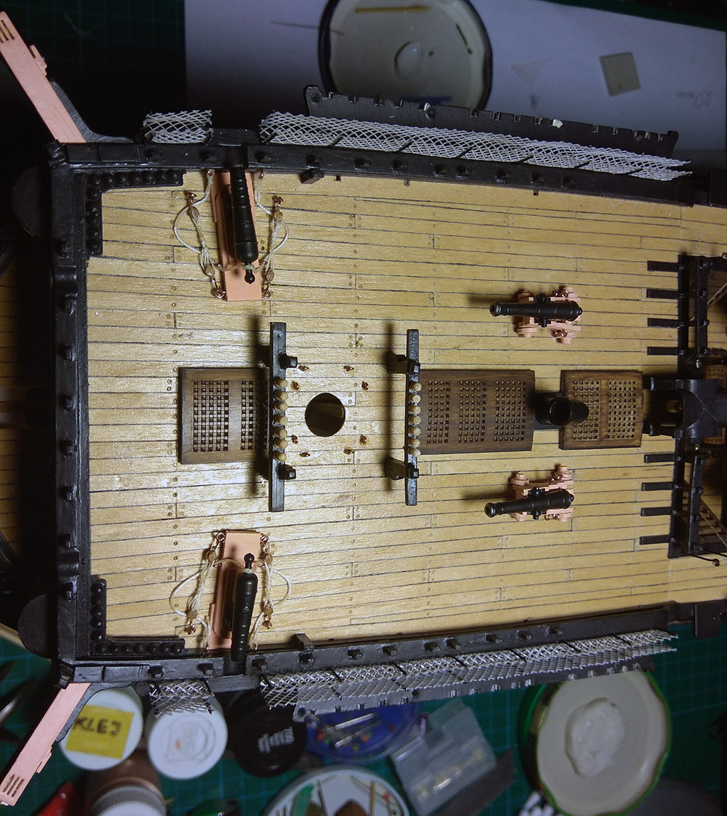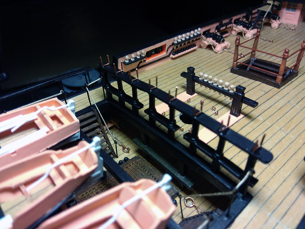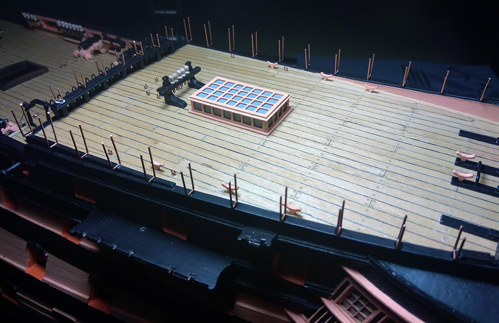 Poręcz na pokładzie rufowym również. Uzbroiłem również pokład rufowy w oczka i knagi