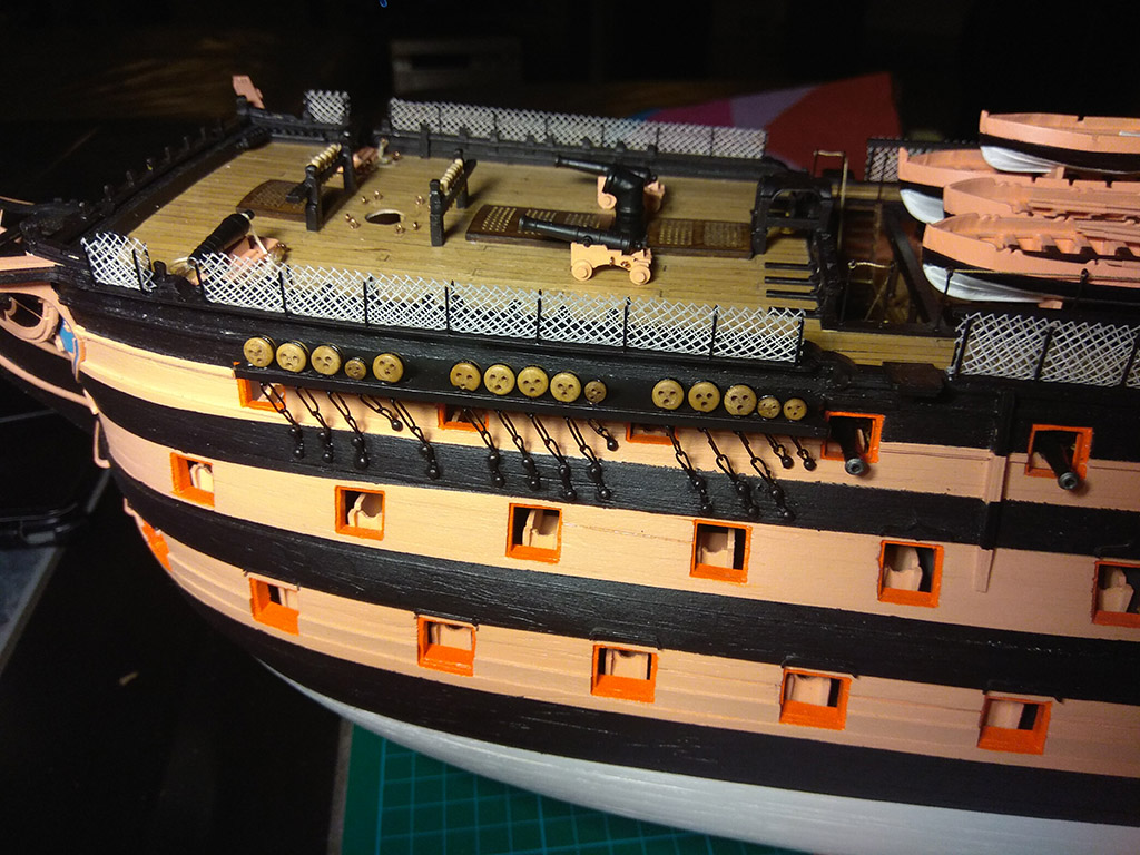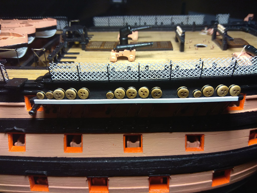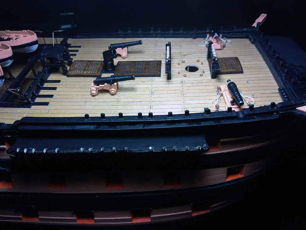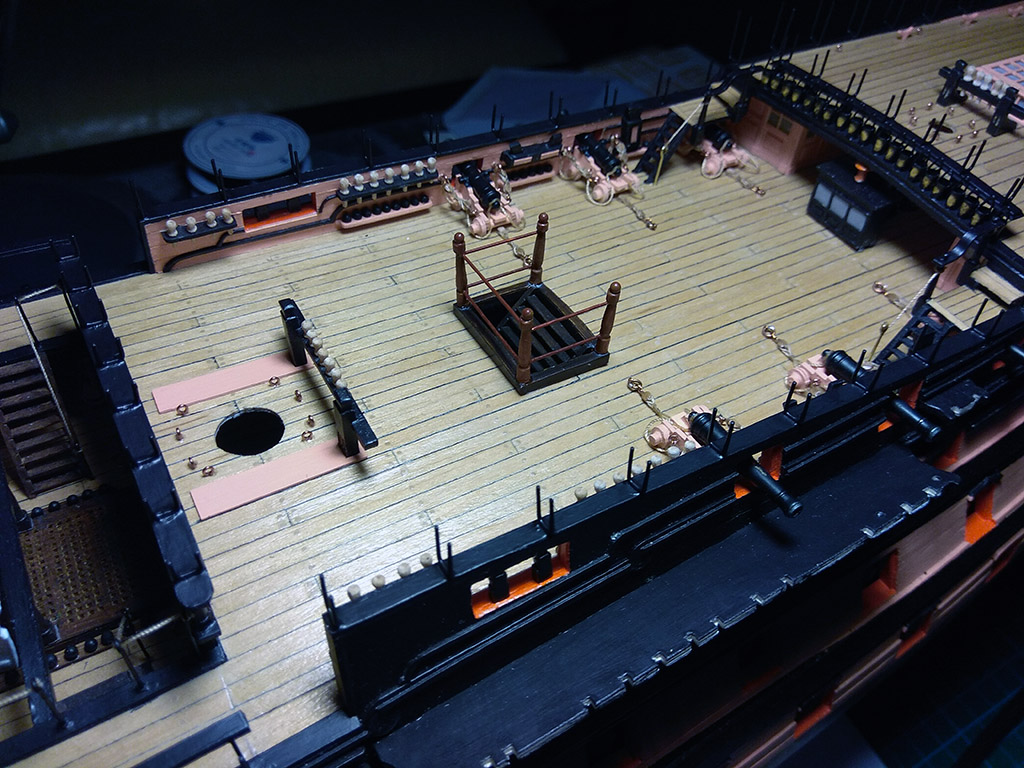 Kolej na przedostatni element pokładów: balustradę schodni, na dremelku wytoczyłem pachołki i dokleiłem stalowe kule armatnie