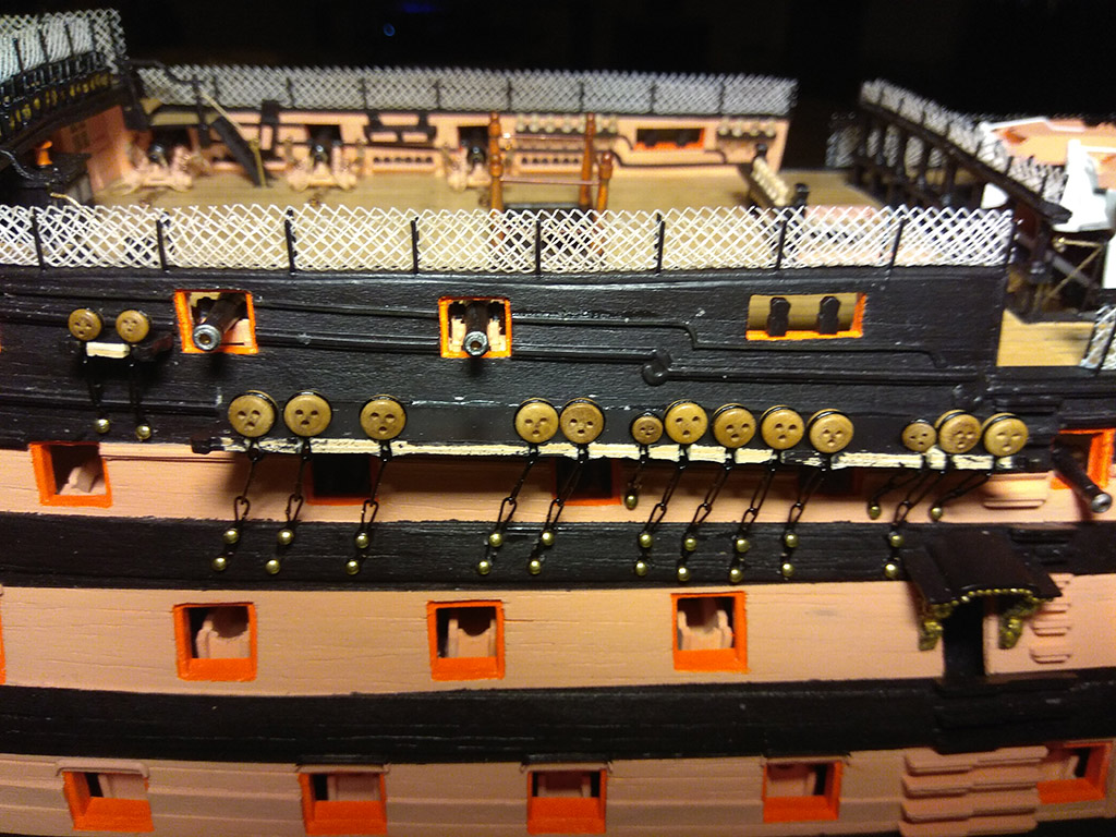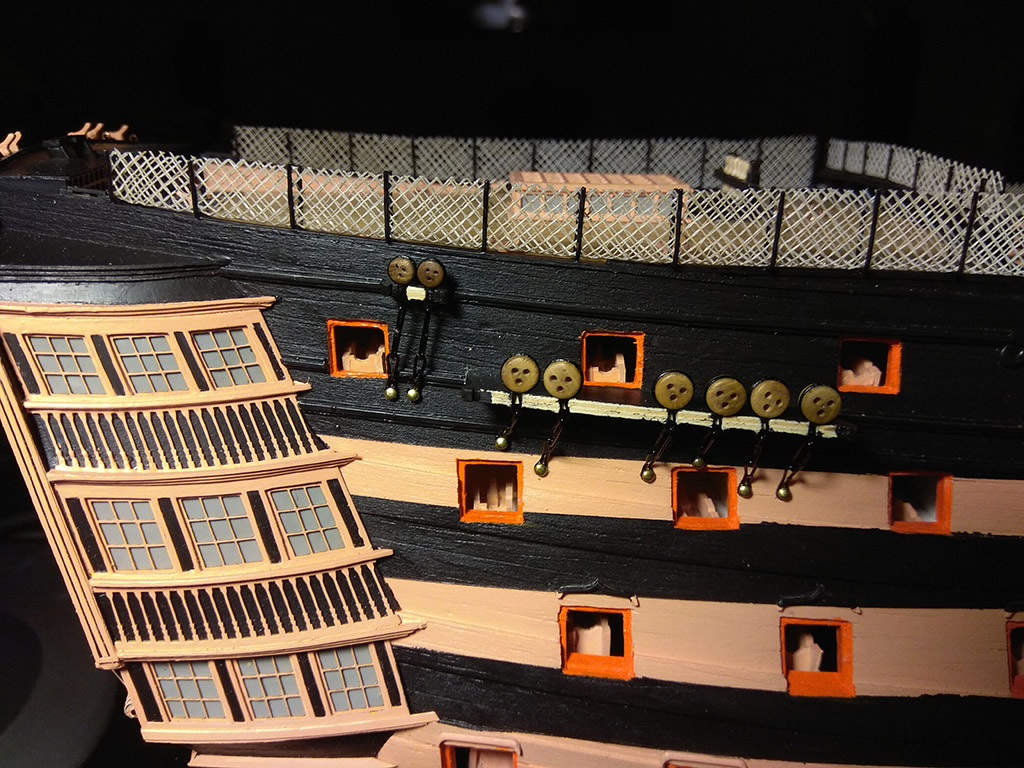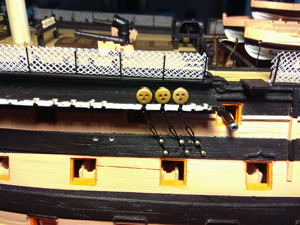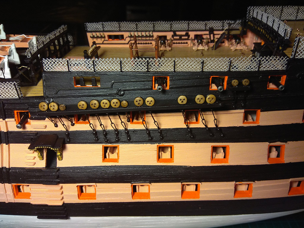 Kolej na przedostatni element pokładów: balustradę schodni, na dremelku wytoczyłem pachołki i dokleiłem stalowe kule armatnie