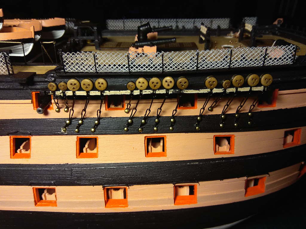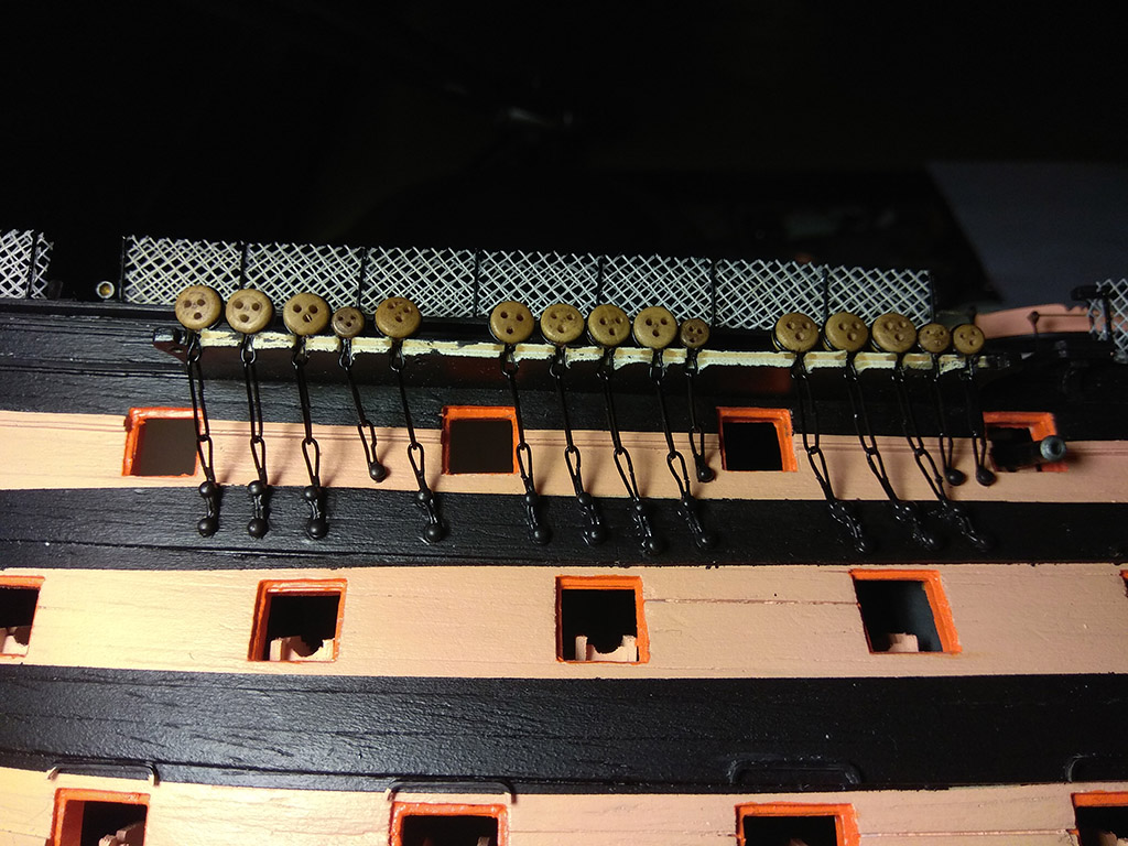 Zbroimy okręt w siatki, dużo tego. Zrobiłem je z firanki, po wycięciu kawałka