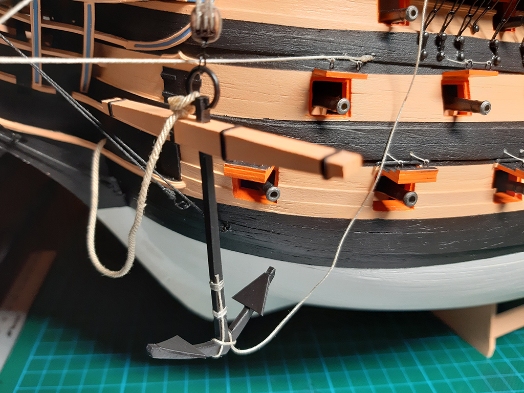 Nigdzie nie znalazłem zdjęcia, jak mocowano koniec liny z windy na wysięgniku, więc dorobiłem "oczojebne" knagi w kolorze furt armatnich i tak zakończyłem ten problem