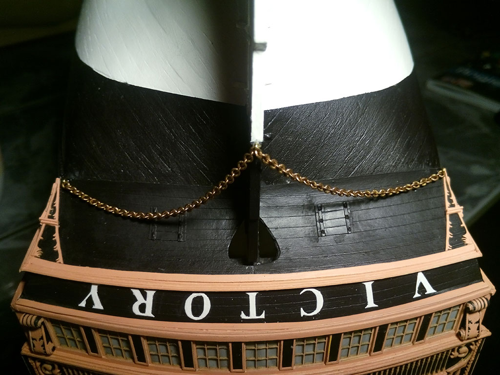 Pozostaje jeszcze dodanie liny na końcach łańcucha. Przyznam jednak, że przebieg tej liny jest dla mnie dość enigmatyczny. Na zdjęciach okrętu widać, że lina ta biegnie w kierunku ławy bezana i gdzieś tam znika.