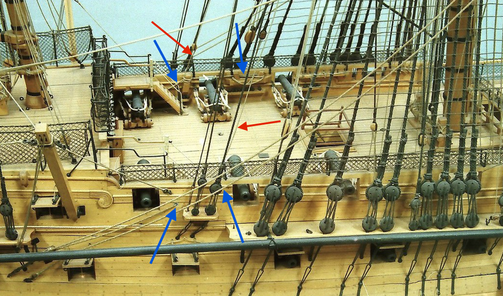 Na tych pachołach odkładana była talia cięgła grotmarsrei (lina zaznaczona czerwoną strzałką). Z kolei ta lina, która ukośnie biegnie za pachołem (zaznaczona strzałką koloru niebieskiego), biegnąca jakby od otworu znajdującego się poniżej ambrazury, to w mojej ocenie szot grota, który przechodził przez ukośny otwór w burcie a następnie był odkładany na pachołach krzyżowych znajdujących się na nadburciu ćwierćpokładu. Ten otwór przez który przechodził szot widać na prawej burcie modelu jak również na tym zdjęciu poniżej.
