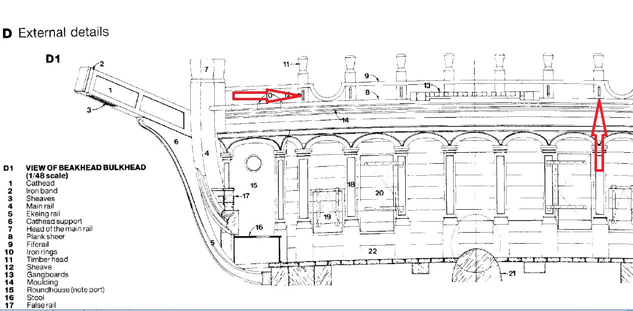 Te otwory to szybry; przechodziły przez nie liny biegnące od strony bukszprytu zanim zostały odłożone na pachołach na tej dziobowej belce.