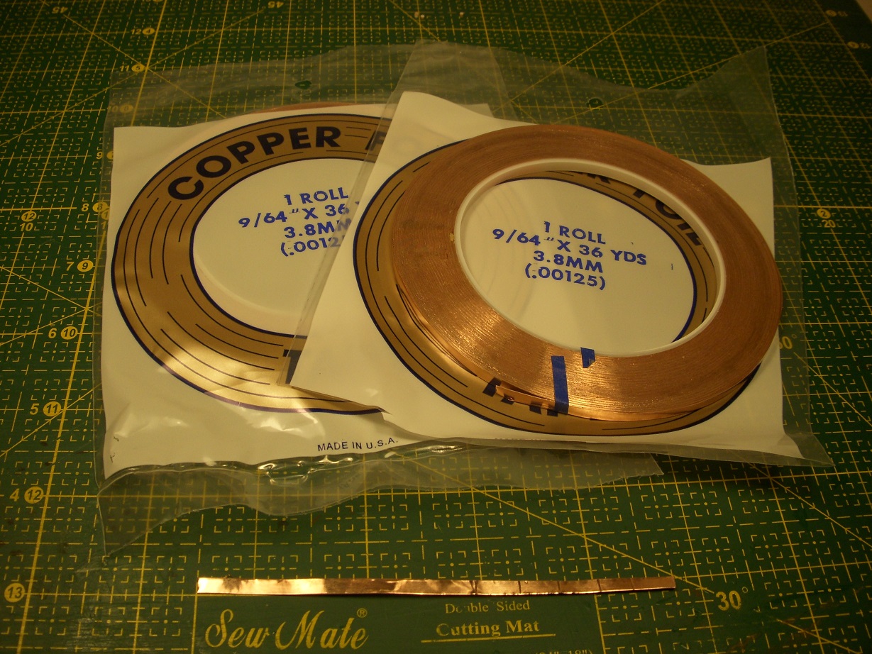 Po kilku przeczytanych materiałach i po wysłuchaniu opinii bardziej doświadczonych Kolegów. Zdecydowałem się jednak na położenie taśmy miedzianej. Klei się i trzyma bardzo dobrze do płaskich powierzchni. Rozmiar (3,8mm) pasuje perfekcyjnie do wyliczeń skalowania i do proponowanych pasów w wycinance.