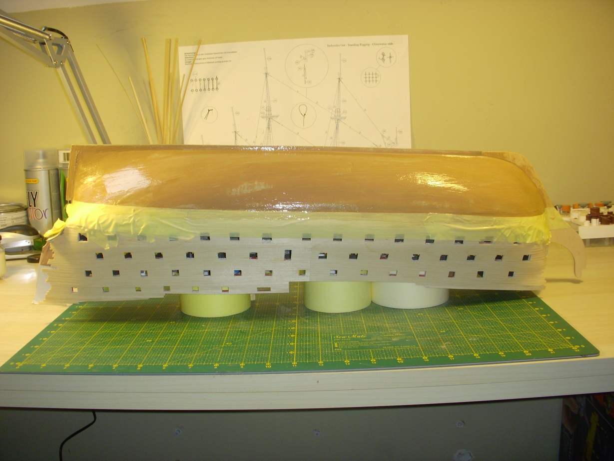 Przy budowie nastepnego modelu nie rob juz tego samego bledu. Odbojniki kladz razem ze zwyklym poszyciem burtowym, bo one sa integralna czescia poszycia, a nie kleisz najpierw planki poszycia i na nie dajesz nastepnie odbojniki (wales). Przestudiuj dokladnie jakis przekroj kadluba - plan na papierze, a zobaczysz, ze odbojniki przylegaly bezposrednio do wreg, tyle tylko ze byly grubsze i masywniejsze, dlatego wystawaly nieco ponad plaszczyzne poszycia.