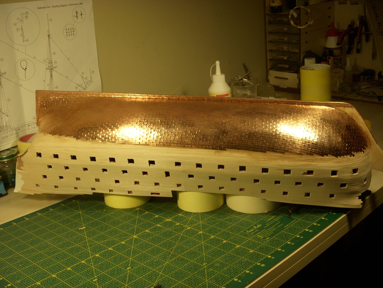Nie wiem Wojtku czy dobrym pomysłem jest układanie miedzianych płyt jeszcze przed malowaniem kadłuba. Może się okazać, że później ładne pomalowanie kadłuba na styku z pasami miedzi nie będzie takie proste. Na tę miedzianą taśmę może być trudno nałożyć taśmę maskującą z uwagi na schodkowe zachodzenie płyt na siebie. Proponowałbym pomalować przynajmniej ten dolny czarny pas i dopiero później układać płyty.