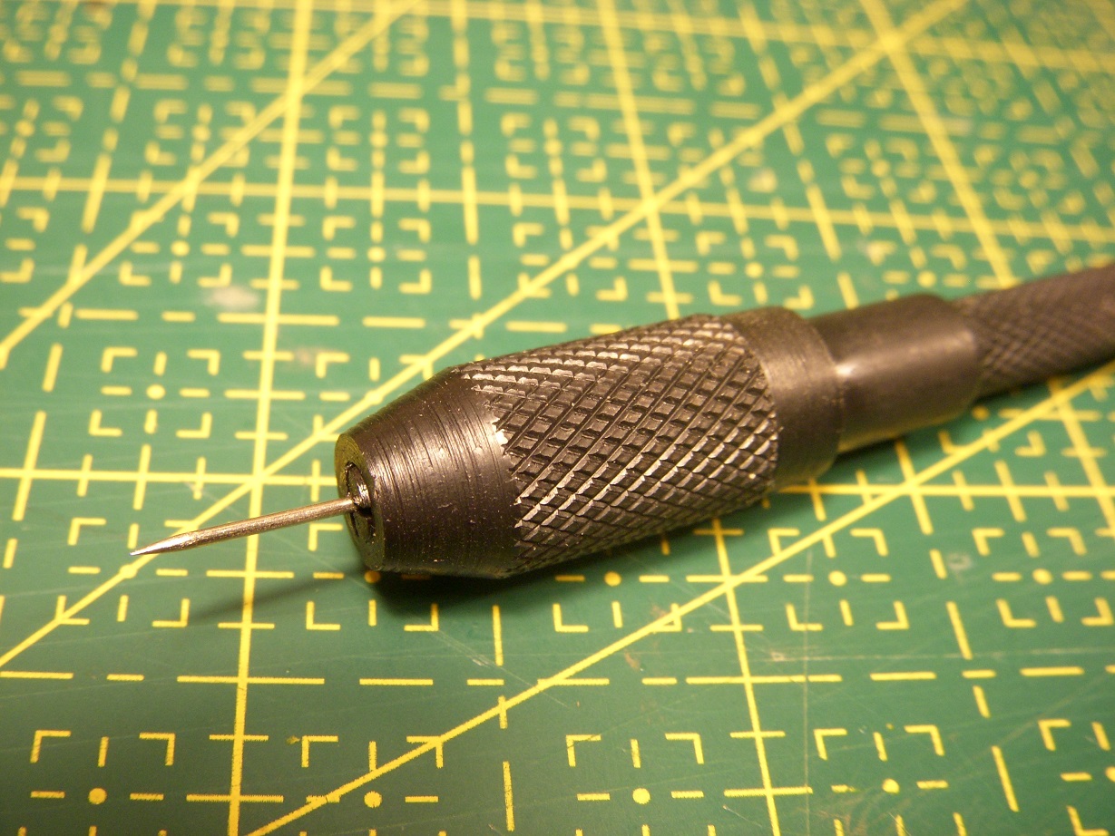 Po skończeniu miedziowania czeka mnie jeszcze wyciskanie nitów. Dziękuję Hadżi za poradę. Ja jednak przyjmę nitowanie jedynie po obrysie płyt. Tak mi się bardziej podoba. Odpowiadając Arturowi, nie zdecydowałem się na radełko. Choc zapewne byłoby to łatwiejsze i szybsze, ale mam wrażenie, że wygląda to trochę zbyt czysto, maszynowo. Dlatego też zdecydowałem się nitować ręcznie przy użyciu narzędzia na zdjęciu. Jest to chwytak ze szpilką zamocowaną w środku, z której uprzednio usunąłem łepek. Wiem, że to więcej pracy, ale tej jest i tak już potwornie dużo więc co mi tam :)