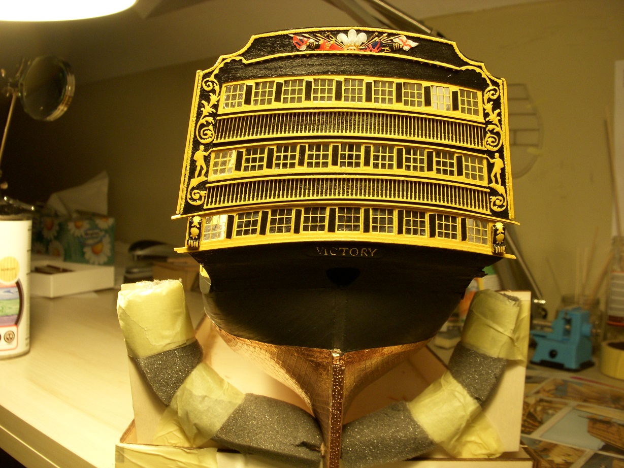 Po chwili przerwy wracam do relacji. Chcąc odpocząć od kadłuba zająłem się rufą. W tej chwili ukończoną mam część tylnią lustra. Poniżej kilka zdjęć wykonanych prac. Pokazałbym wcześniej, gdyby nie Artur :lol: Zostały jeszcze poprawki i do dokończenia napis 'Victory'.