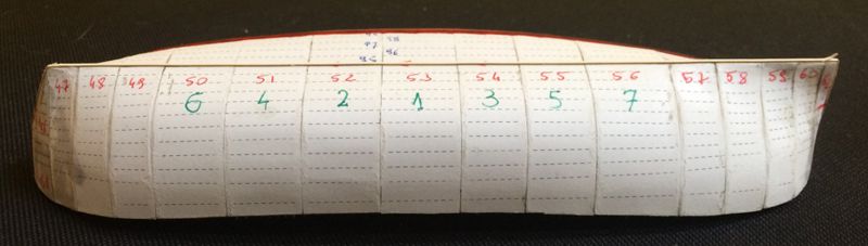 ... po czym wyszlifowałem skosy na wręgach i zacząłem przyklejać podposzycie. Tu nie sugerowałem się numeracją części lecz zacząłem oklejać od środka okrętu jednocześnie ku dziobowi i rufie (kolejność klejenia oznaczają zielone numery). Oczywiście NIE wyciąłem od razu wszystkich elementów podposzycia, ale wycinałem je pojedynczo i dopiero gdy spasowałem poprzedni element wycinałem kolejny (tu muszę przyznać, że opracowanie modelu jest bardzo dobre - spasowanie sprowadzało się do stwierdzenia, że wszystko pasuje