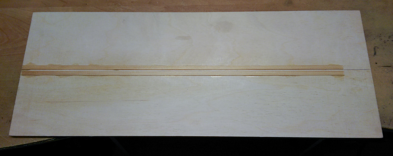 Szkielet jest kartonowy i mimo, że dość sztywny, to jednak obawiałem się zwichrowania przy piankowaniu. Potrzebna była jakaś stabilizacja na czas piankowania. Podumałem i wydumałem taką metodę: przygotowałem kawałek grubszej sklejki z naklejonymi dwoma listwami, tak, aby stępka ciasno się tam wpasowała.