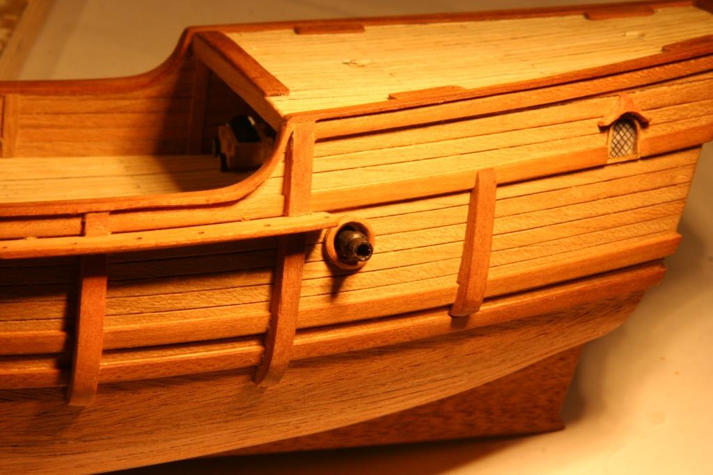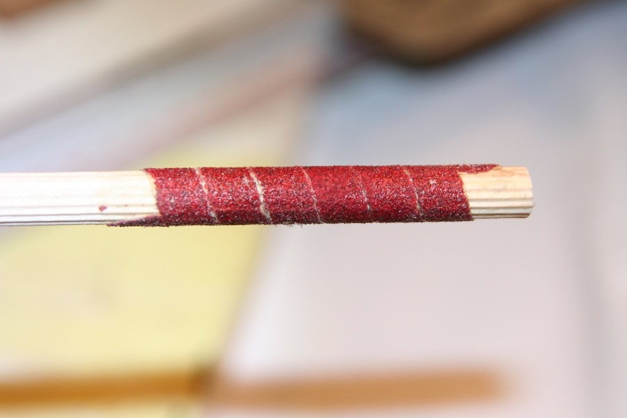 Armaty może dziwne inne ale takie właśnie są w planach tej wycinanki i nie chciałem tutaj kombinować. Widziałem, że w relacjach z Shipyardu są zupełnie inne jak wiele innych rozwiązań. Doklejone również ławy wantowe i obramowania otworów strzelniczych i liny kotwicy. Technologii wyrobu obręczy na forum jest bardzo wiele ja wybrałem pokazaną na zdjęciach. W listewce robię otwór i załamuje wewnętrzną krawędź wykonanym na takie potrzeby kołeczkiem stożkowym z naklejonym papierem ściernym. Nastepnie "nadziewam" to na patyk i szlifuję zewnątrz do wymaganego kształtu. I brakowało mi jeszcze czegoś przy okienkach wiec wydłubałem daszki